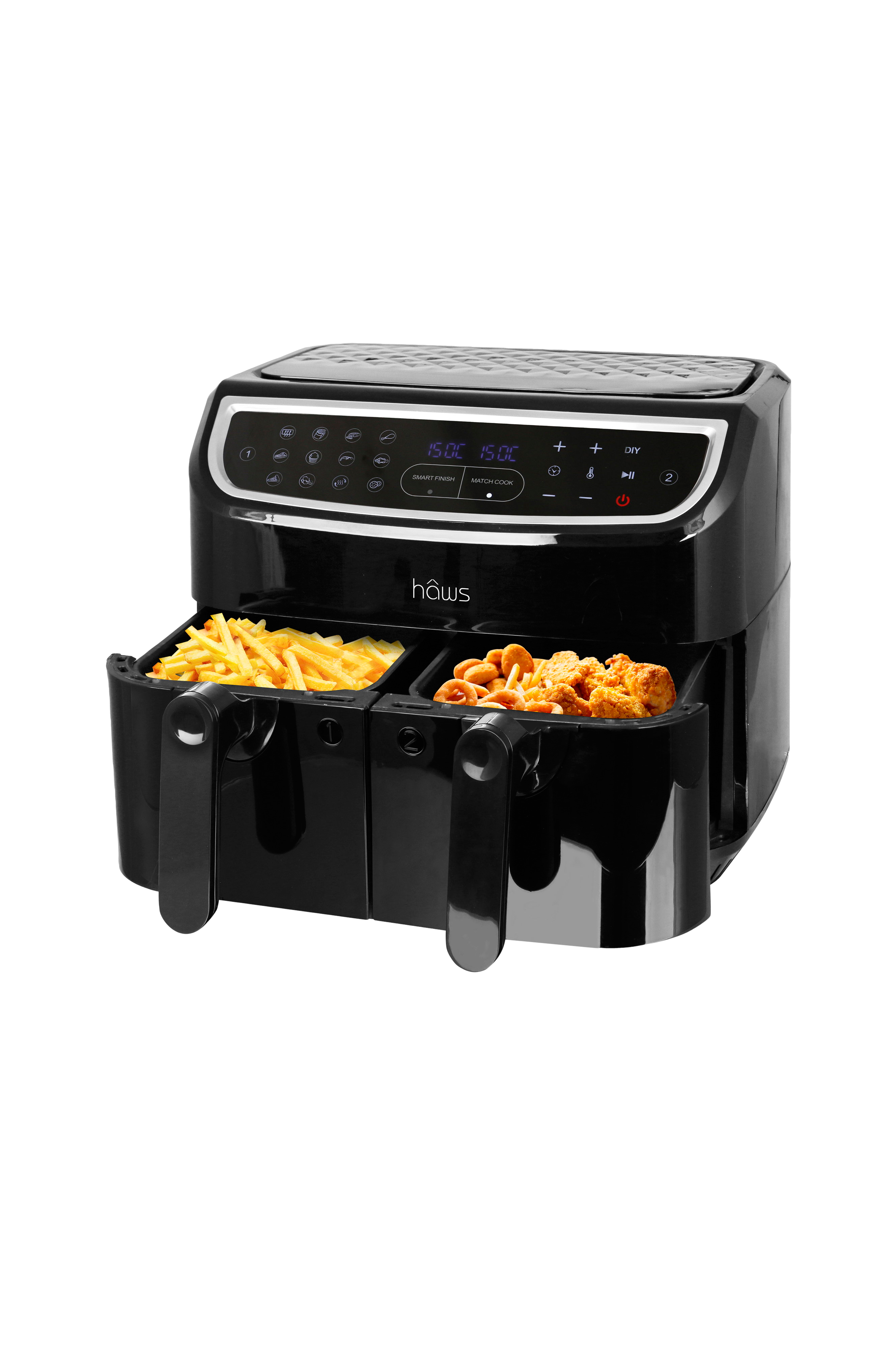 Hâws dobbelte airfryer 2.0 giver dig mulighed for at få sprød og saftig mad uden høje kalorier, store mængder olie og pfas. Airfry-teknologi er betegnelsen for en varmluftsfryser, der bruger op til 75 % mindre olie ved tilberedning. Luften i airfryeren cirkulerer hurtigere, og tilberedningstiden er derfor kortere end i en traditionel ovn. Den forkortede tilberedningstid kan spare på elregningen. Produktet har en kapacitet på 9 liter fordelt på 2 kurve med en kapacitet på 4,5 liter hver. Det betyder, at du kan tilberede 2 måltider på én gang. Temperaturen kan justeres fra 80-200 grader. Produktet afgiver en lyd, når et program er færdigt, og har også automatisk nedlukning og beskyttelse mod overophedning. Air finish-funktion: Du kan starte forskellige retter i de to kurve med forskellige tilberedningstider og temperaturer på samme tid. Selv om tilberedningsmetoderne har forskellige tider, sikrer air finish-funktionen, at begge er færdige med at tilberede på samme tid. Match cook-funktion: designet til at have den samme mad i begge kurve (f.eks. dobbelt så mange pommes frites), kurvene indstilles identisk med blot et par klik, så indholdet er klar på samme tid. Produktet kan tilberede kød, grøntsager, kager og meget mere. Kun fantasien sætter grænser for dette produkt. Belægningen er ilag, og den er pfas-fri.