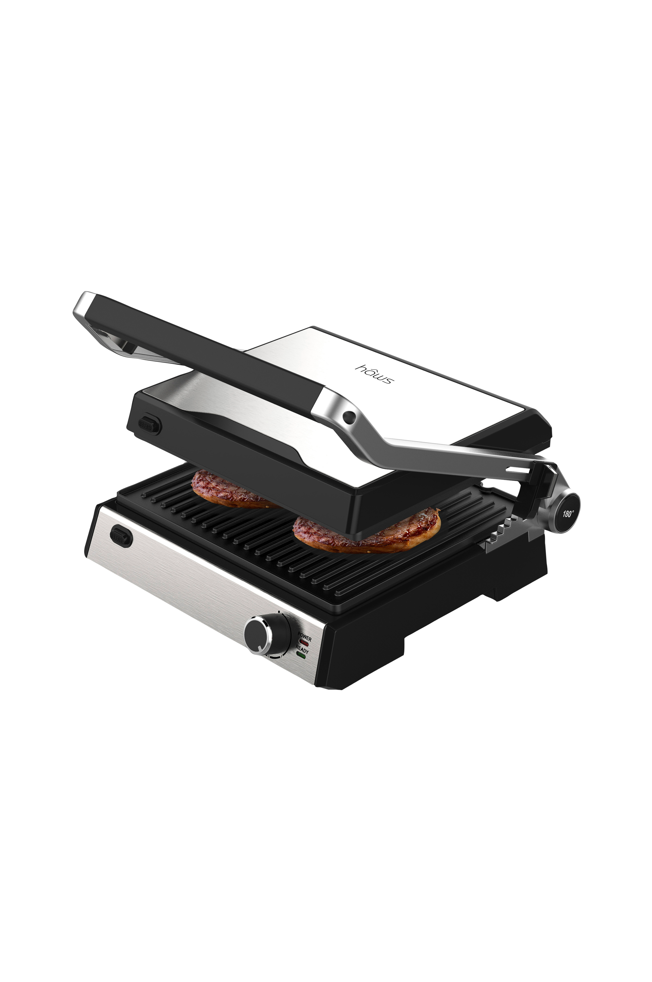 Hâws pro bord- og paninigrill har et stilrent design og kan ud over at lave lækre sandwich, toast, panini m.m. også åbnes 180 grader og bruges som grill på bordet. Grillfladen/pladerne måler 29 x 26 cm og er nemme at rengøre, dels på grund af overfladen, men også fordi de er aftagelige. Belægningen på pladerne er ilag, hvilket betyder, at de er pfas-fri. Produktets temperatur kan indstilles, og en indikatorlampe viser, hvornår det er færdigt. Drypbakken er aftagelig, og ledningen kan nemt opbevares på produktet, når det skal opbevares. Den kan nemt justeres i højden, så den passer til den mad, der tilberedes.