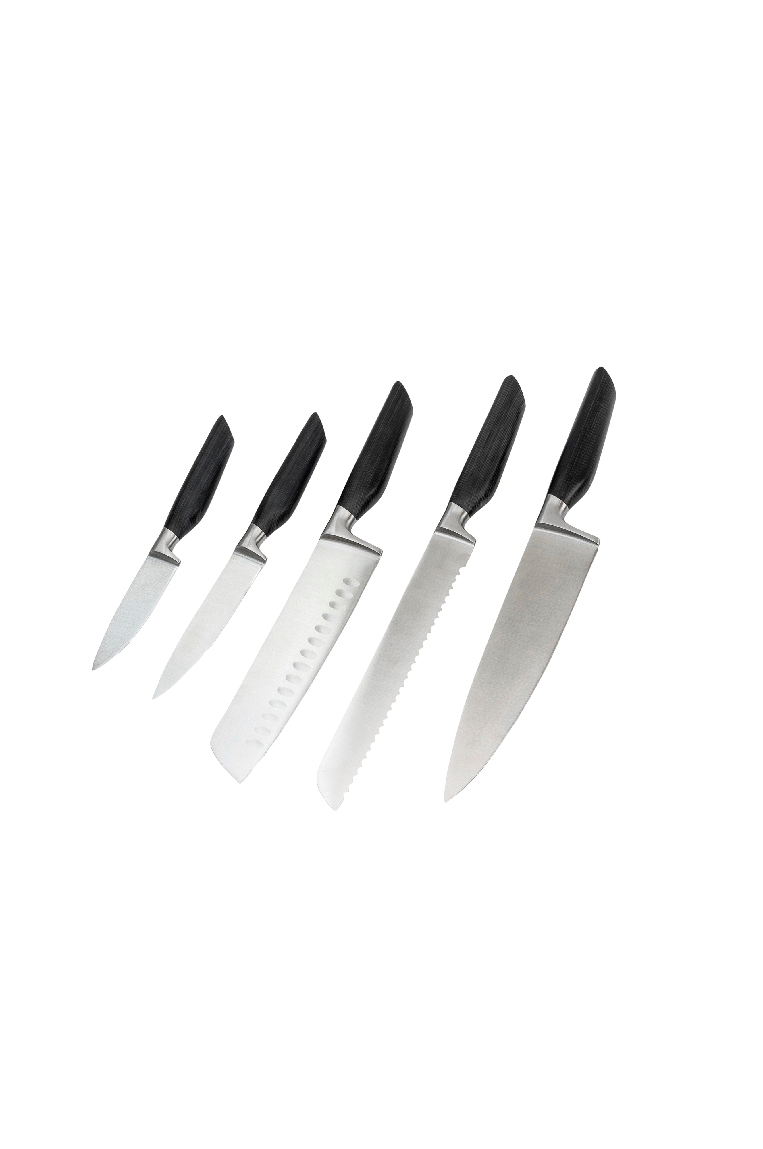 Hâws santo, hvor hvert snit er en symfoni af præcision og elegance. Vi introducerer vores knivsæt med 5 dele, herunder en kokkekniv, brødkniv, santoku-kniv, universalkniv og grøntsagskniv - med alsidighed til at opfylde alle dine køkkenbehov. Hver kniv er fremstillet med enestående omhu og sans for detaljer.