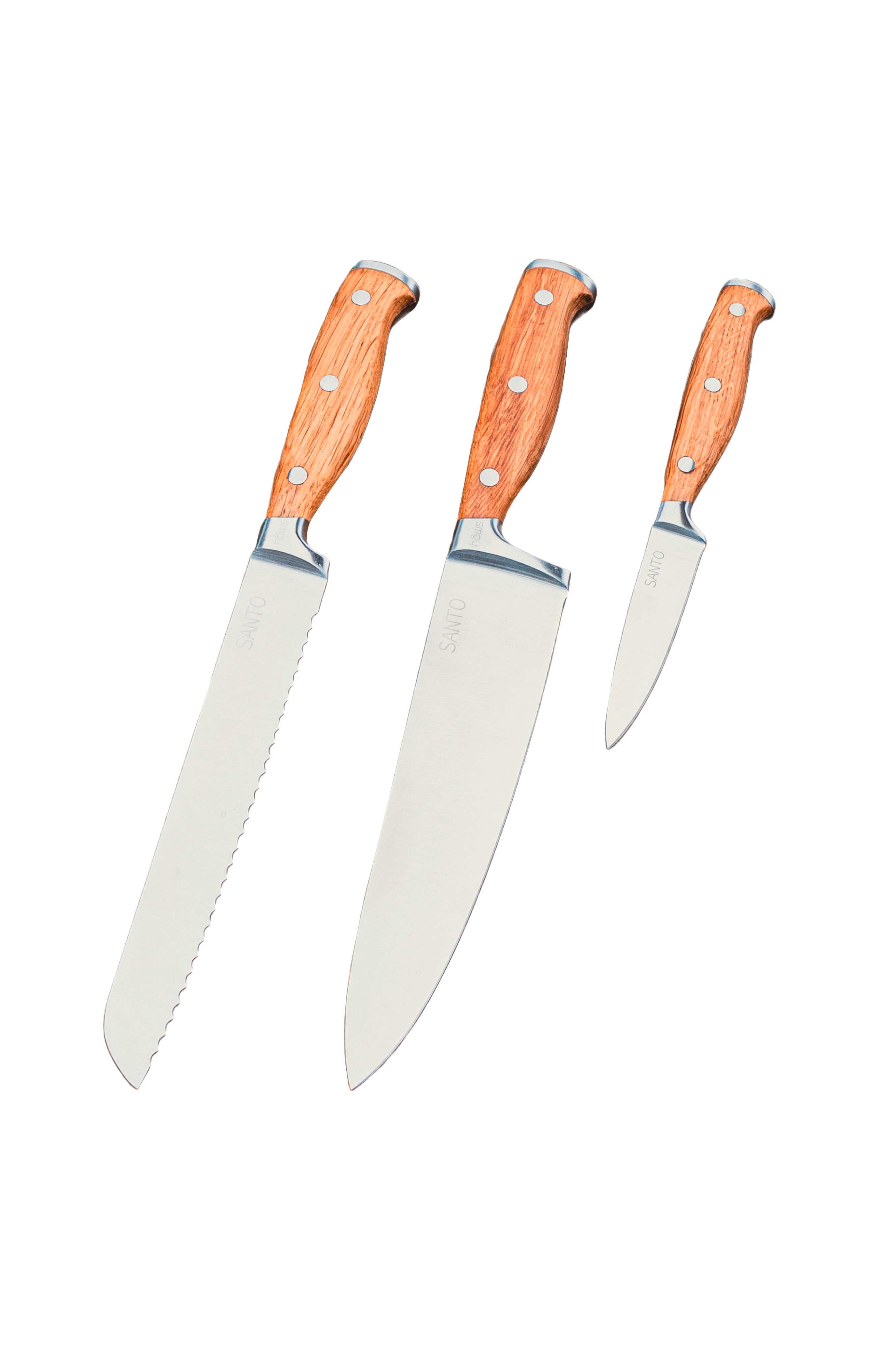 Hâws santo, hvor hvert snit er en symfoni af præcision og elegance. Vi præsenterer vores 3-delte knivsæt med kokkekniv, brødkniv og urtekniv, som er alsidige og opfylder alle dine behov i køkkenet. Hver kniv er fremstillet med enestående omhu og sans for detaljer. Bladene er smedet af rustbestandigt 5cr15mov-stål, hvilket garanterer langvarig skarphed og præcision.