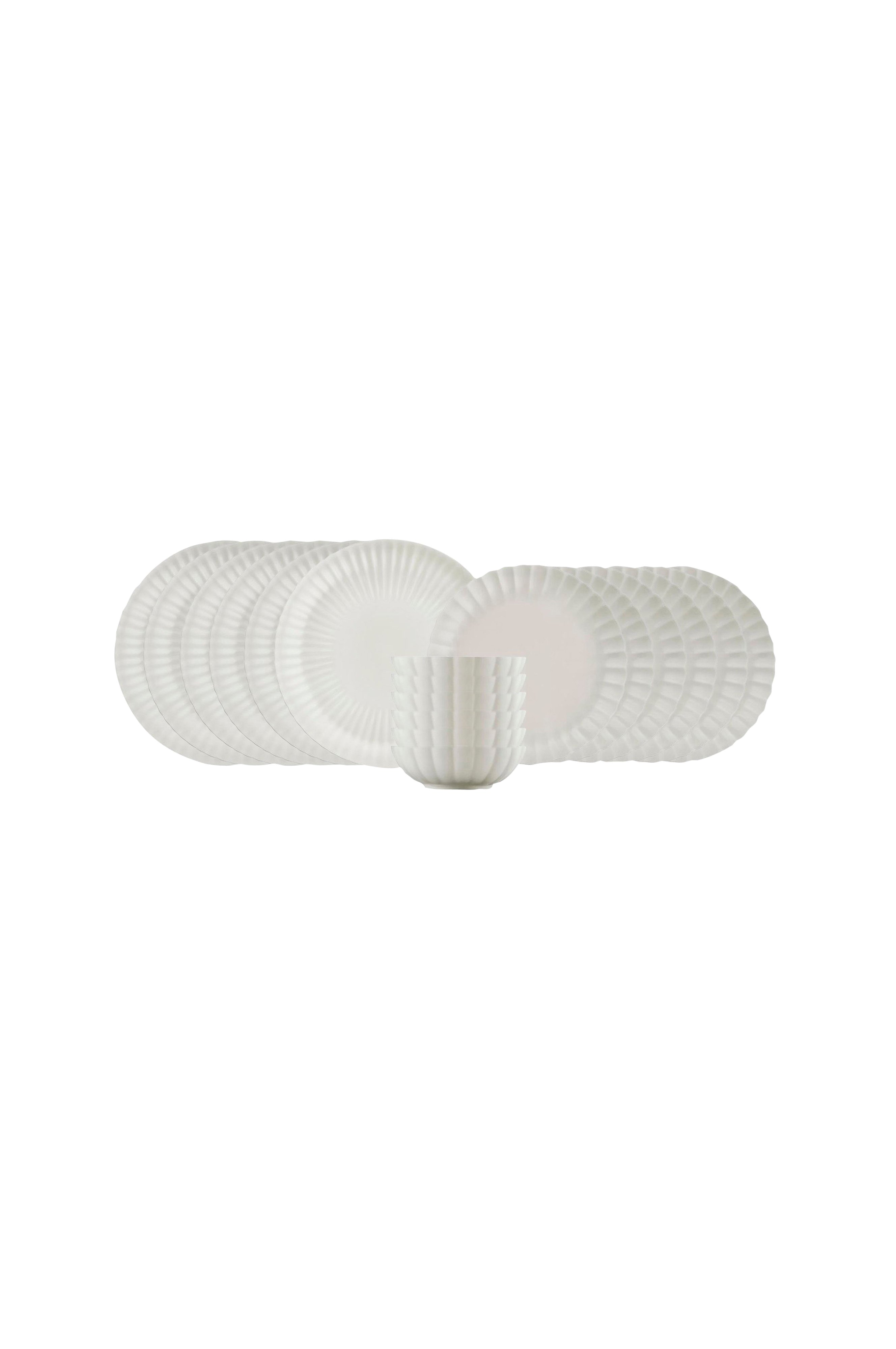 100% porcelænServicetallerken: 27 cm (6 stk.)dyb tallerken: 20 cm (6 stk.)skål: 15 cm (6 stk.)