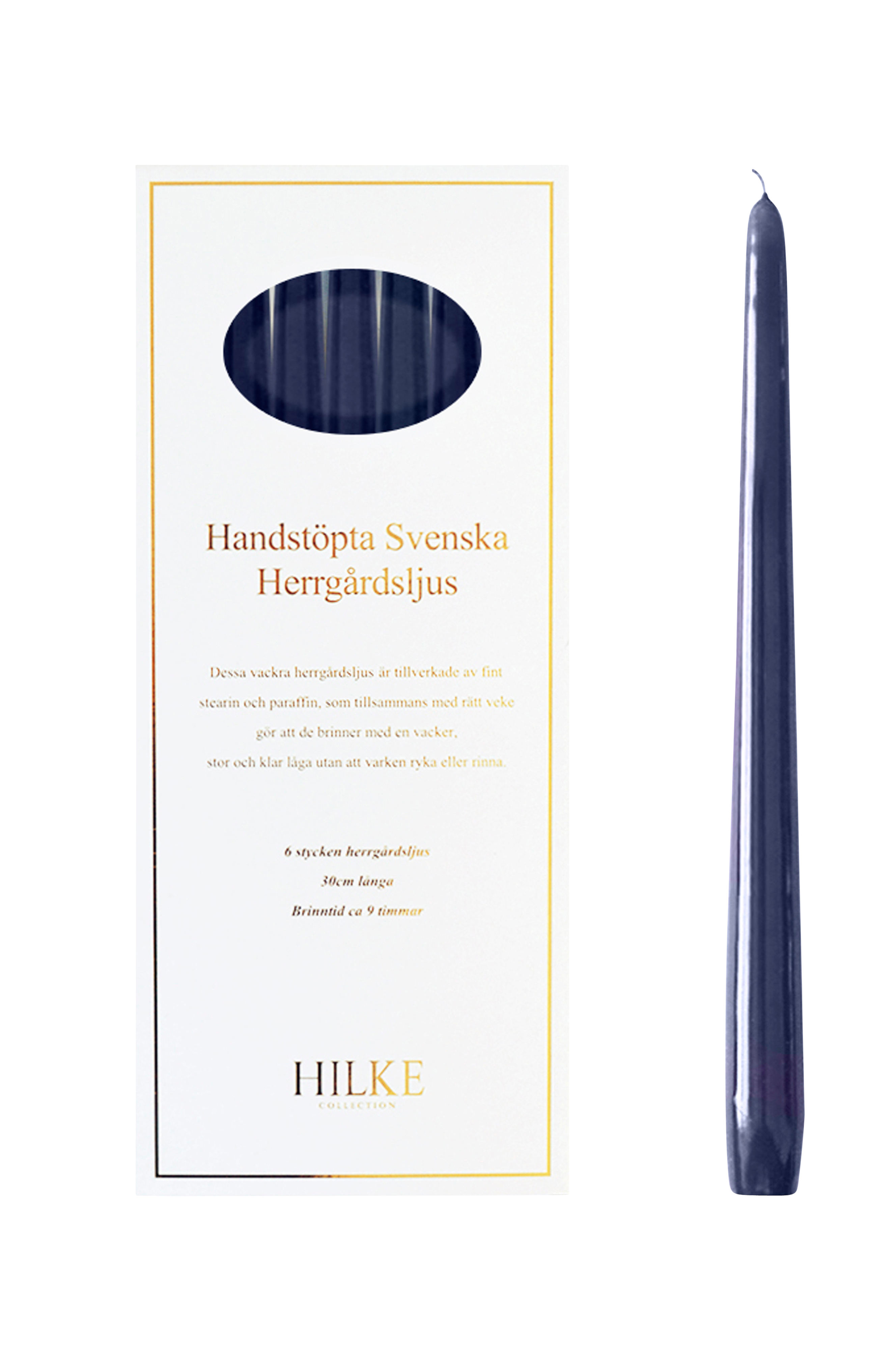 Vores svenske håndstøbte herregårdslys er fremstillet i den fineste kvalitet og har en fantastisk glans. Lysene er blot dyppet i farve og gennemfarvede, da det er det bedste for miljøet og lysets brændeegenskaber og giver rige, smukke farver. Herregårdslysene er fremstillet af stearin og RAL-certificeret paraffin. Stearin sammen med den rigtige væge betyder at lyset brænder med en smuk, stor og klar flamme uden at den ryger eller løber. Lysene leveres i en smuk gaveindpakning med 6 lys. Perfekt som gave og perfekt til vores lysestager. 30 cm lange. Brændetid ca. 9 timer.