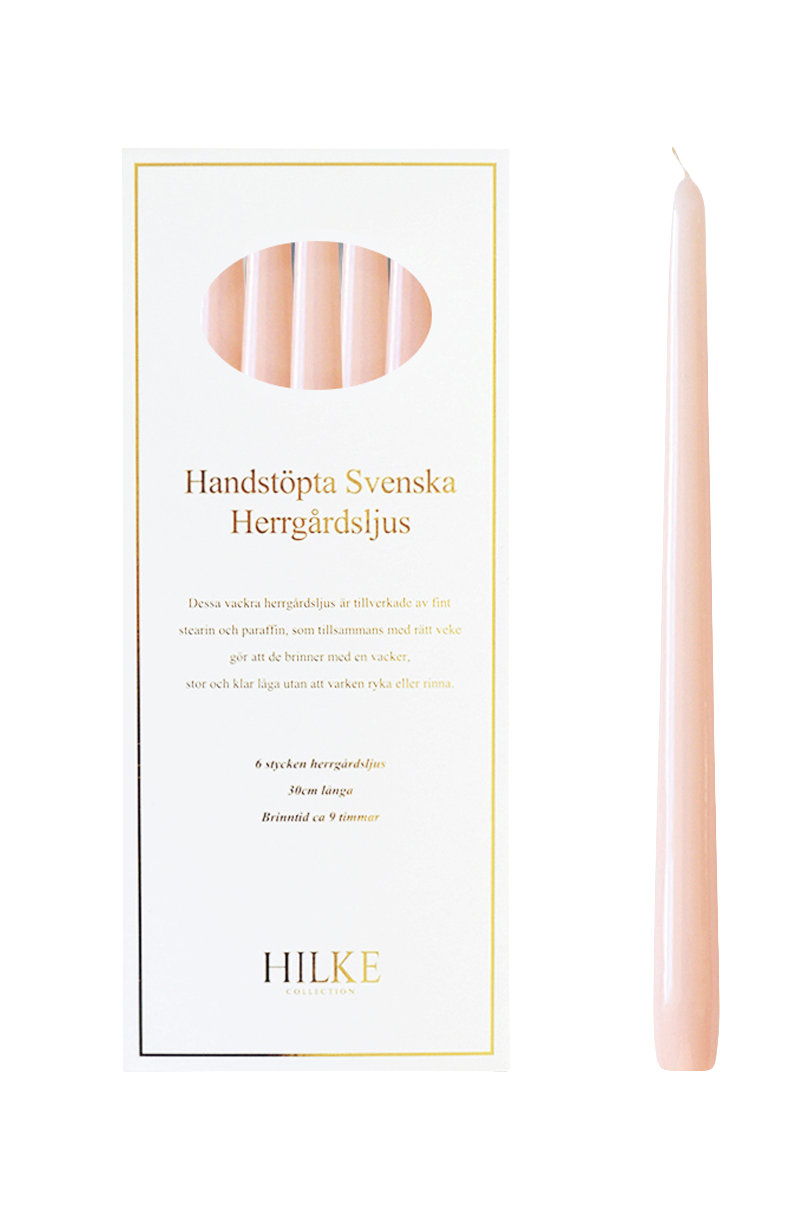 Vores svenske håndstøbte herregårdslys er fremstillet i den fineste kvalitet og har en fantastisk glans. Lysene er blot dyppet i farve og gennemfarvede, da det er det bedste for miljøet og lysets brændeegenskaber og giver rige, smukke farver. Herregårdslysene er fremstillet af stearin og RAL-certificeret paraffin. Stearin sammen med den rigtige væge betyder at lyset brænder med en smuk, stor og klar flamme uden at den ryger eller løber. Lysene leveres i en smuk gaveindpakning med 6 lys. Perfekt som gave og perfekt til vores lysestager. 30 cm lange. Brændetid ca. 9 timer.