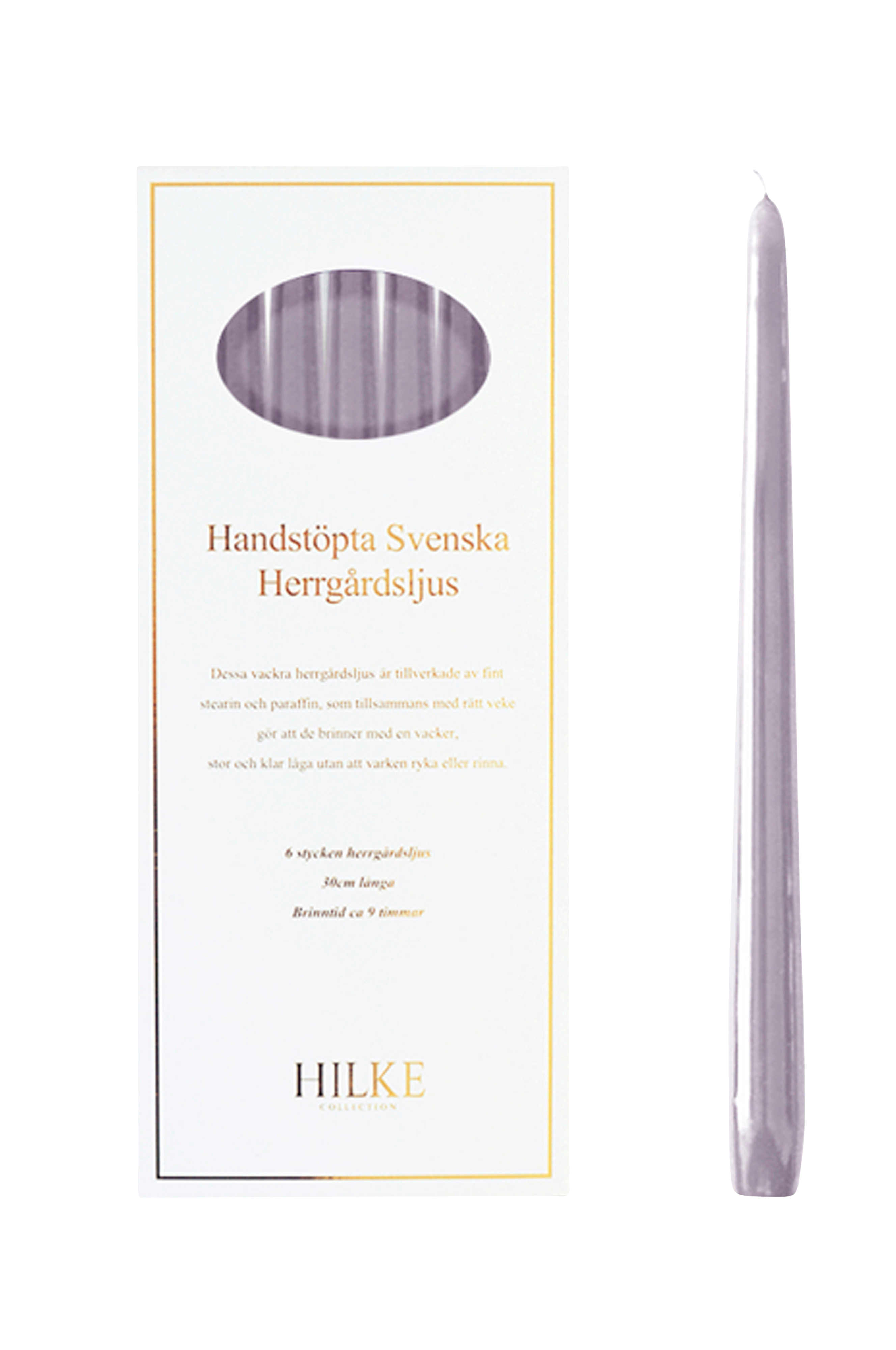 Vores svenske håndstøbte herregårdslys er fremstillet i den fineste kvalitet og har en fantastisk glans. Lysene er blot dyppet i farve og gennemfarvede, da det er det bedste for miljøet og lysets brændeegenskaber og giver rige, smukke farver. Herregårdslysene er fremstillet af stearin og RAL-certificeret paraffin. Stearin sammen med den rigtige væge betyder at lyset brænder med en smuk, stor og klar flamme uden at den ryger eller løber. Lysene leveres i en smuk gaveindpakning med 6 lys. Perfekt som gave og perfekt til vores lysestager. 30 cm lange. Brændetid ca. 9 timer.