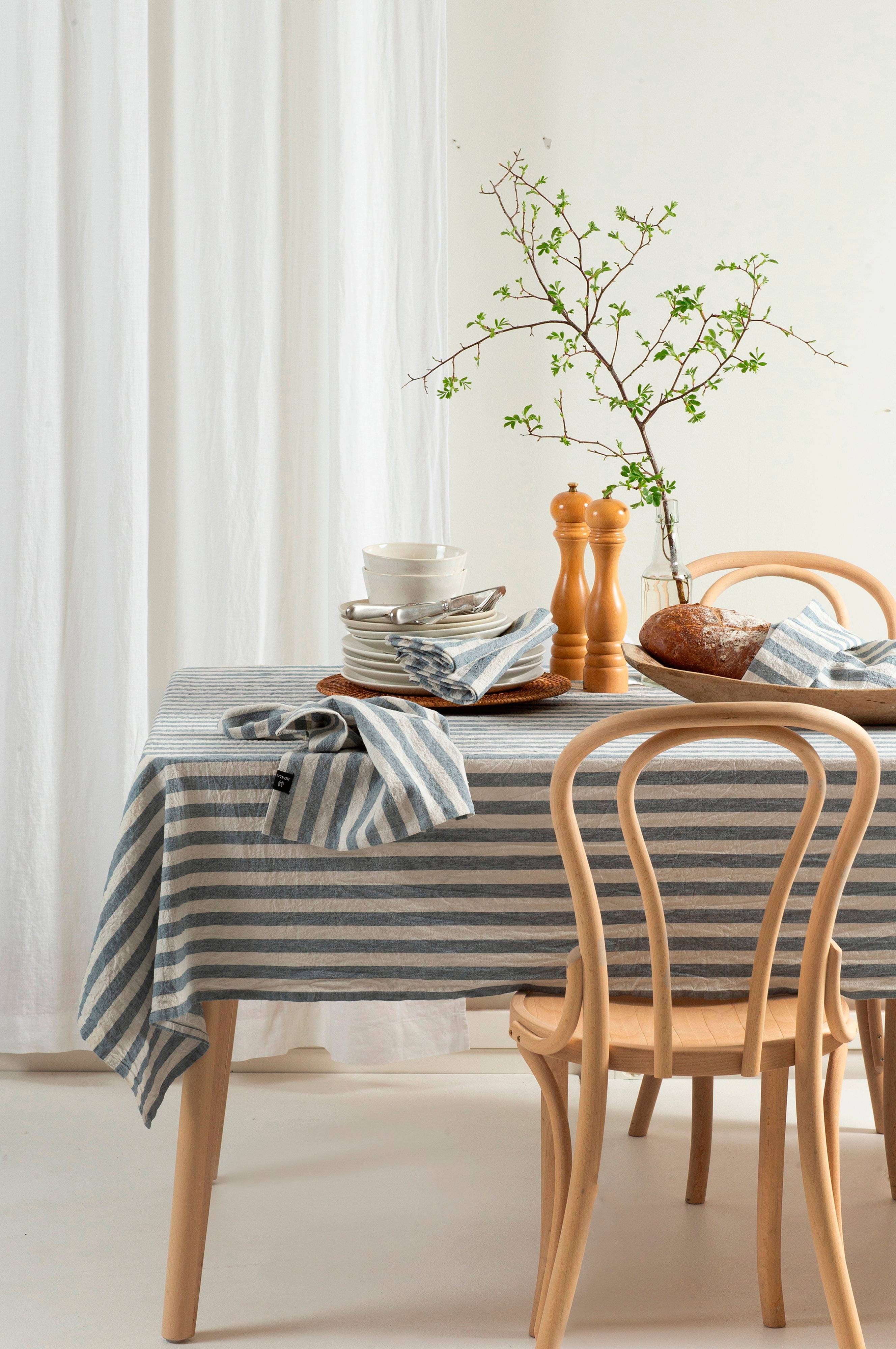 Riviera er en kollektion i halvlinned med klare striber i sommerlige farver. Dugen er vasket efter syning, hvilket giver et afslappet udtryk og en blød fornemmelse. Riviera er nem at pleje: Efter vask tørretumbles den let ved lav temperatur, og rynkerne bevares for en livlig fornemmelse. Maskinvask 60°C, krympning 3-5%.