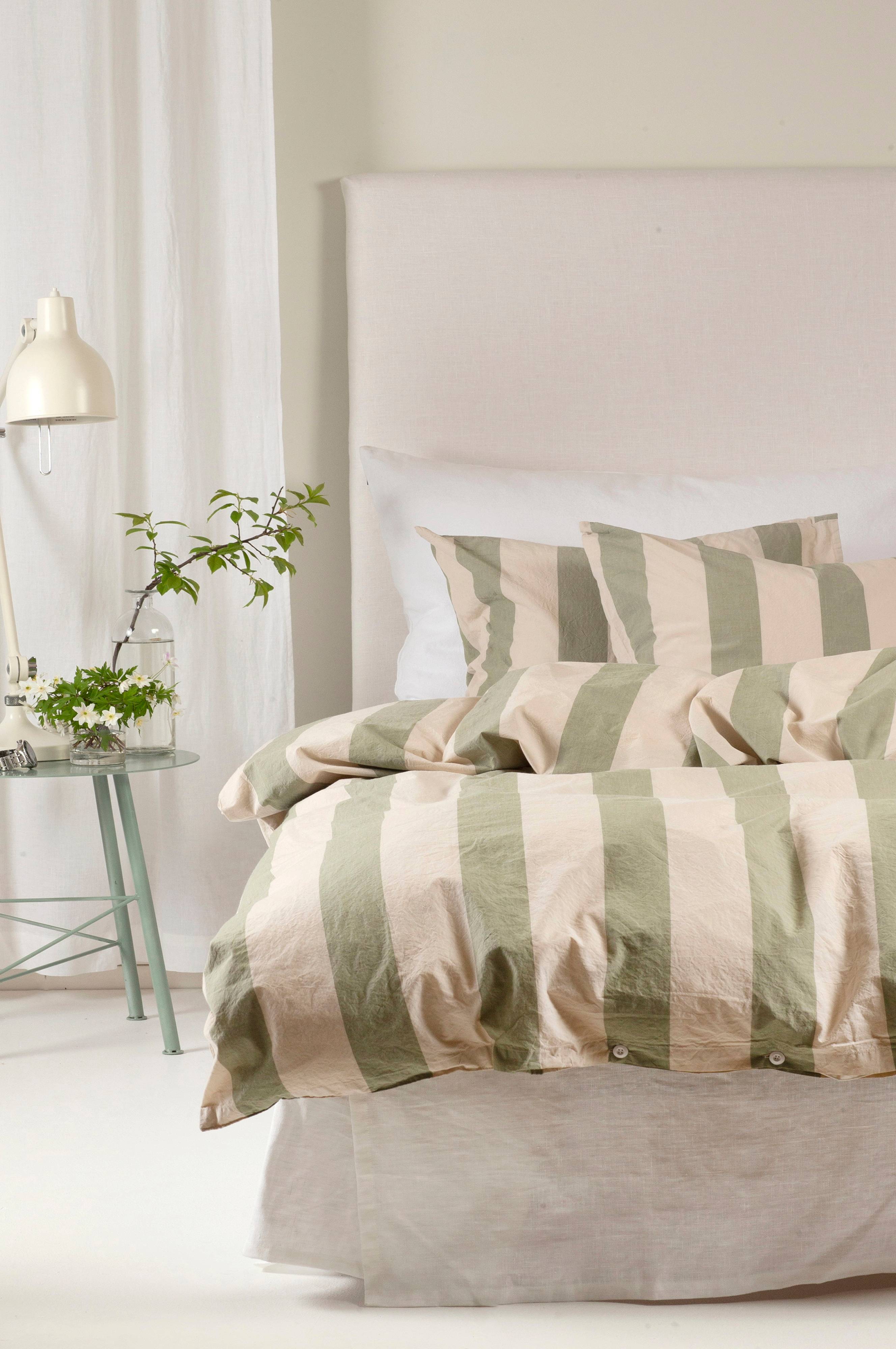 Daydreamer er himlas blokstribede sengelinnedserie i sprød og kølig percale. Fremstillet af kæmmet bomuld med en trådtæthed på 200 tc og vasket efter syning. Åbning med knapper i bunden. Produktet er certificeret med oeko-tex. Pudebetræk sælges separat. Maskinvask 60°c, krympning 1-3%.