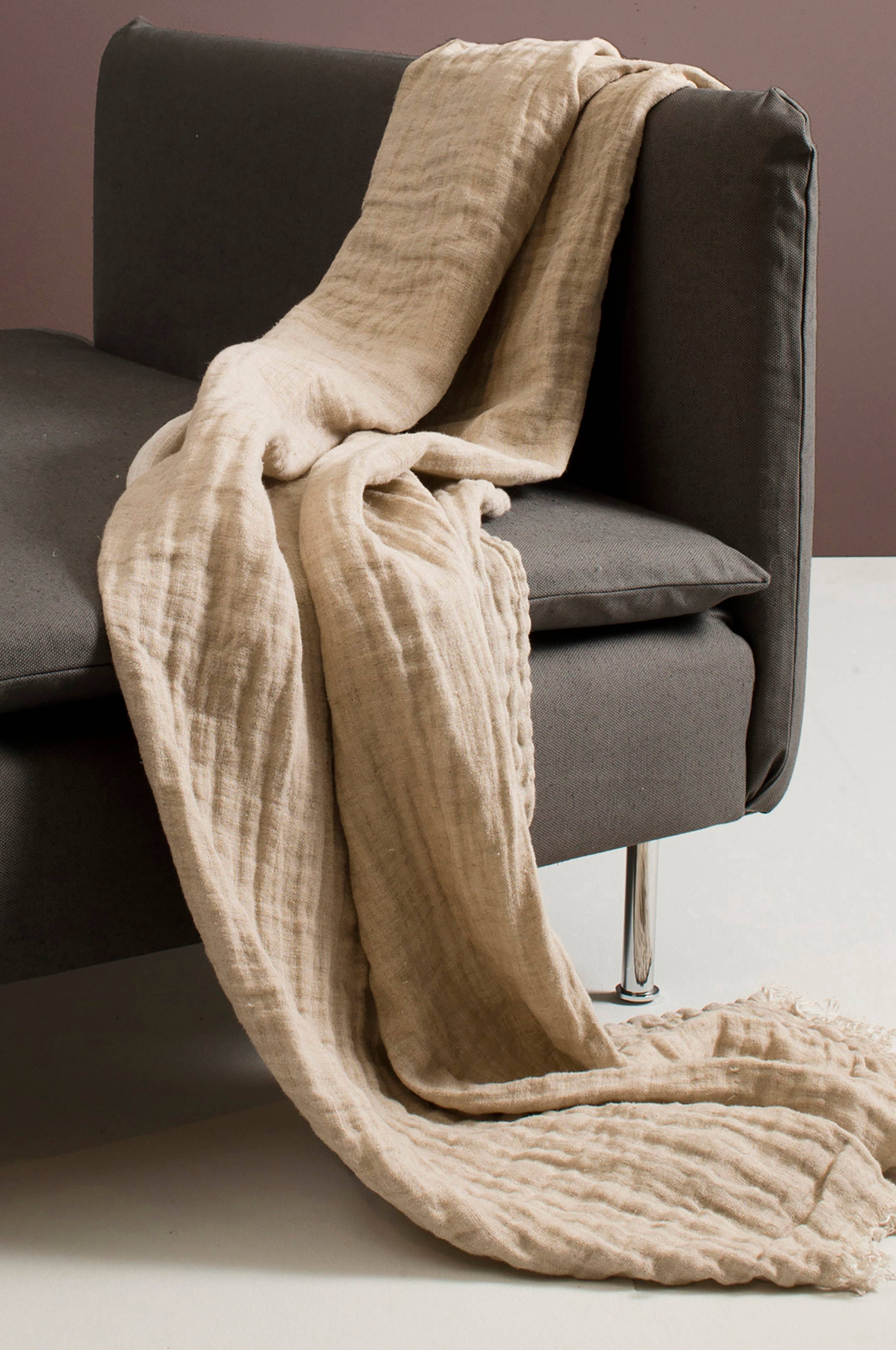 Hannelin er et tæppe i dobbeltvævet hør, der er vasket for at få et krøllet look. Plaiden er kantet langs de lange sider og har frynser på de korte sider. Maskinvask 40°C skåneprogram, tørretumbling ved lav varme, vaskes separat. Kan krympe 1-2%.