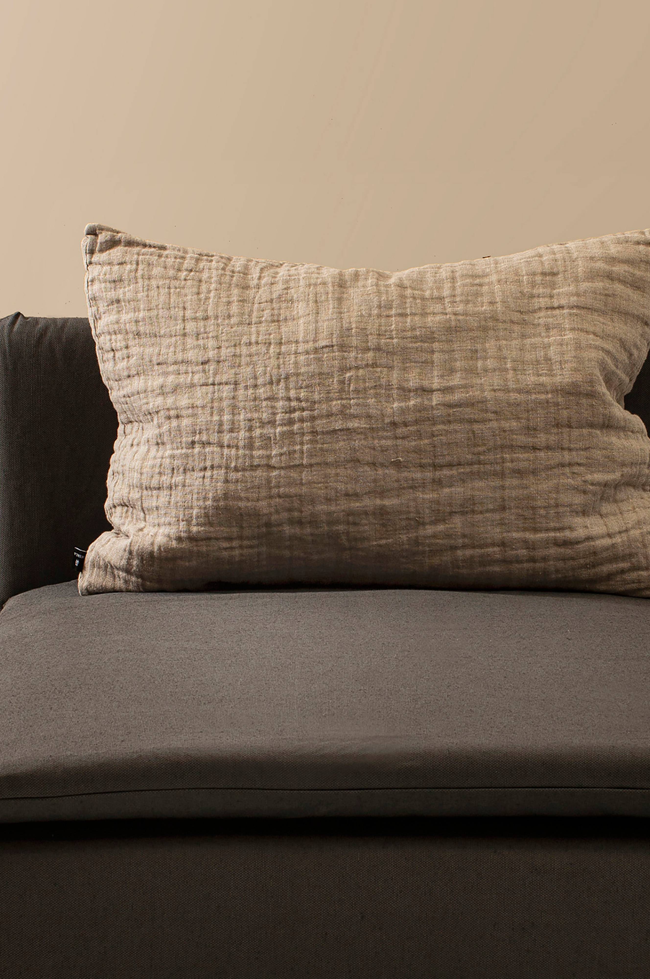 Hannelin er et dobbeltvævet linned, der er vasket, så det får et markant krøllet look. Puden har en overlappende åbning på bagsiden. Maskinvask 40°C skåneprogram, tørretumbling ved lav varme, vaskes separat. Kan krympe 1-2%.