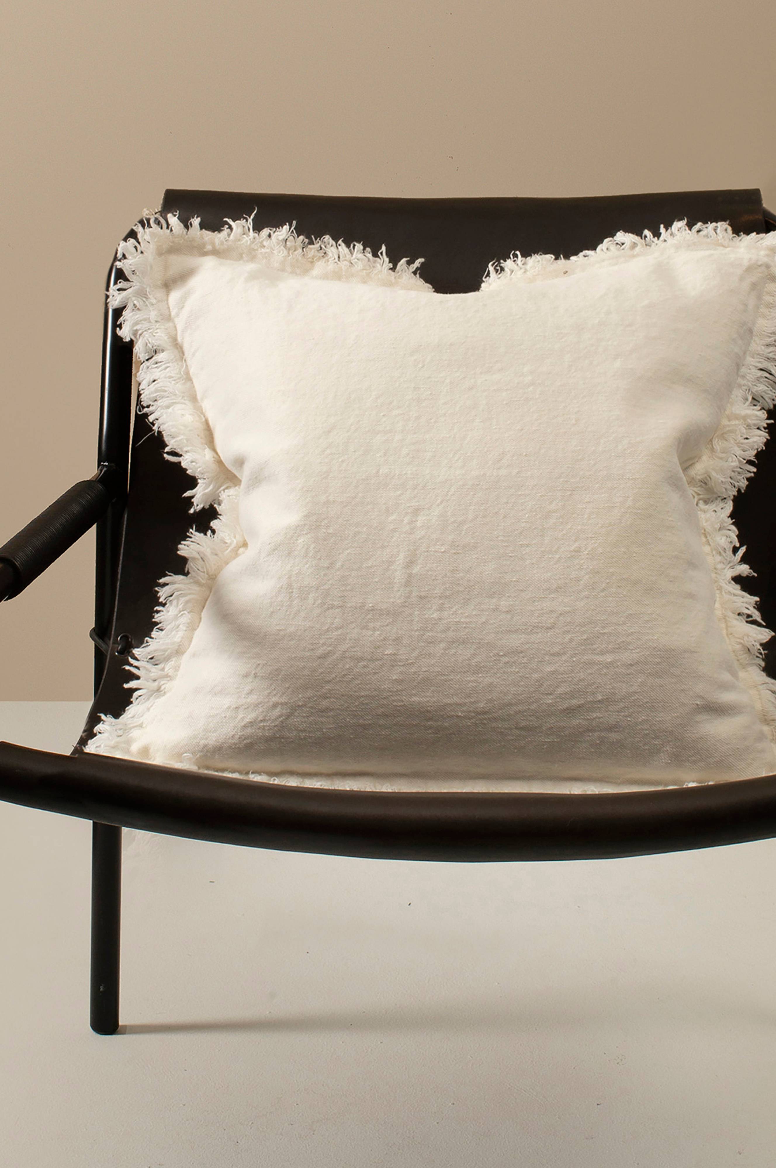 Merlin er en pude lavet af hørtwill vævet sammen med uldtråde. Vævningen giver et meleret look. Puden har lange frynser langs kanterne og en overlappende åbning på bagsiden. Maskinvask på uldprogram 40°C
