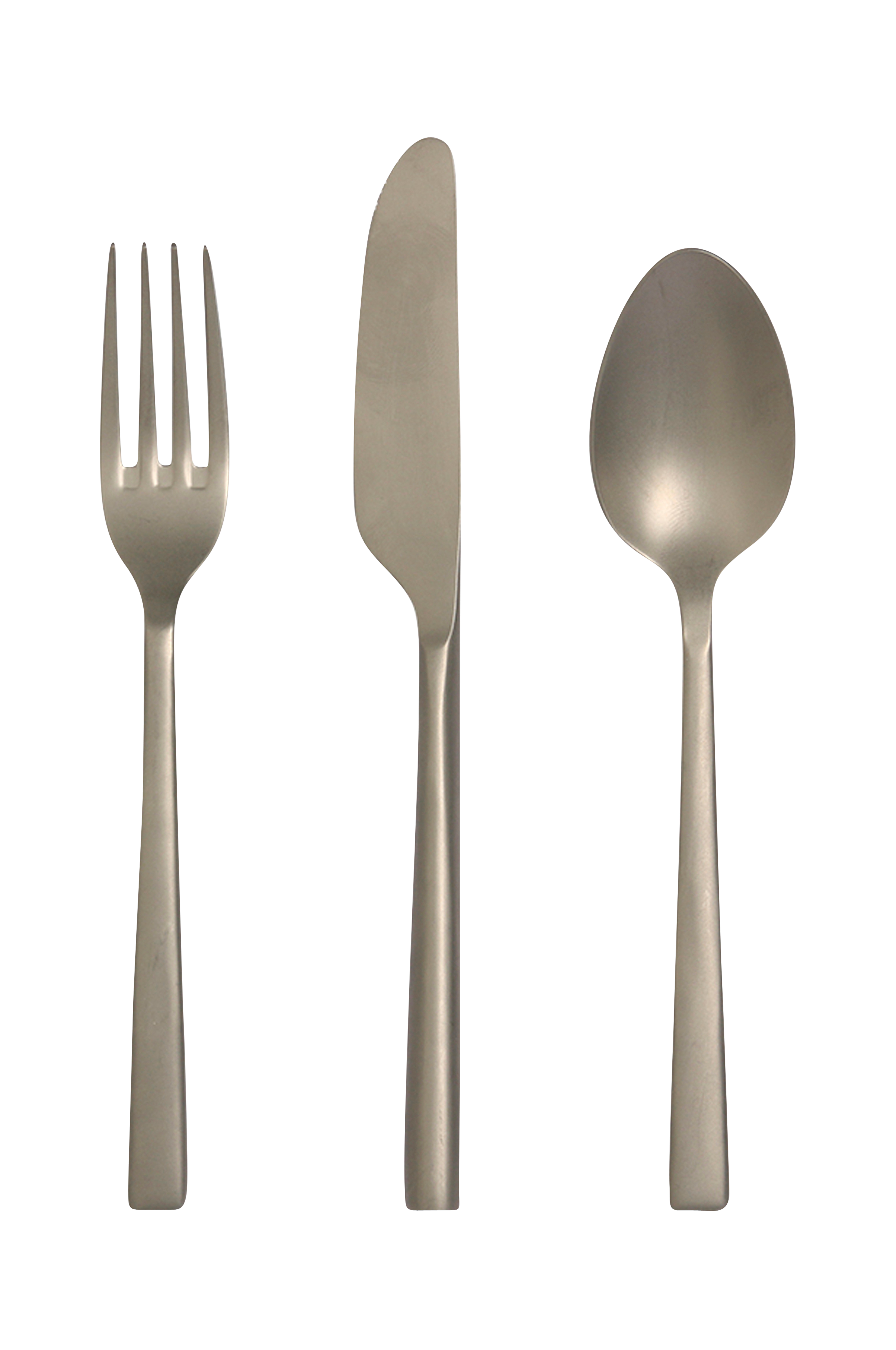 Bestiksæt i 3 dele og består af kniv, gaffel og ske i rustfrit stål. Designet er praktisk og enkelt, farven passer til alt og giver et fint look til din borddækning. Mål 19/19/21 cm.