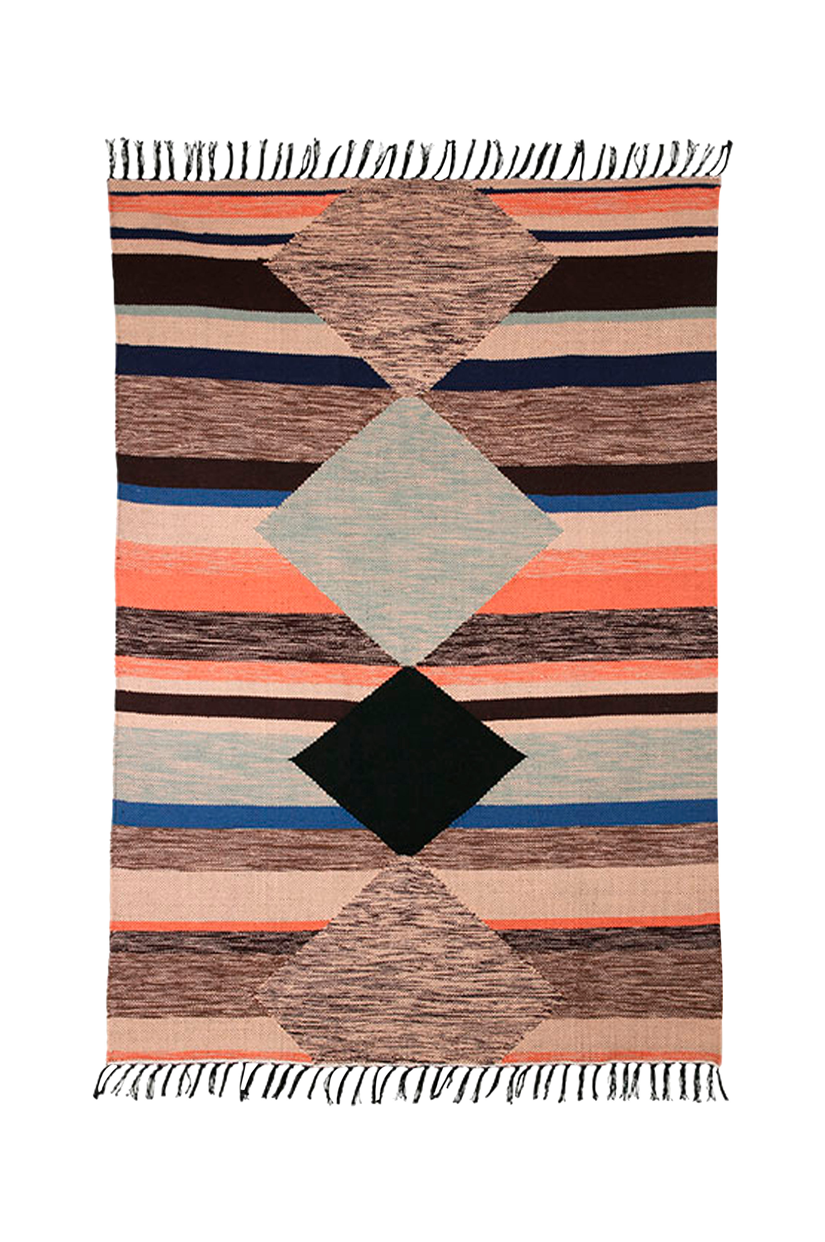 Håndvævet tæppe. Kan bruges både indendørs og udendørs. Mål 120x180 cm. Lavet af genindvundne PET-flasker. Højtryksrens. Tørres fladtliggende.