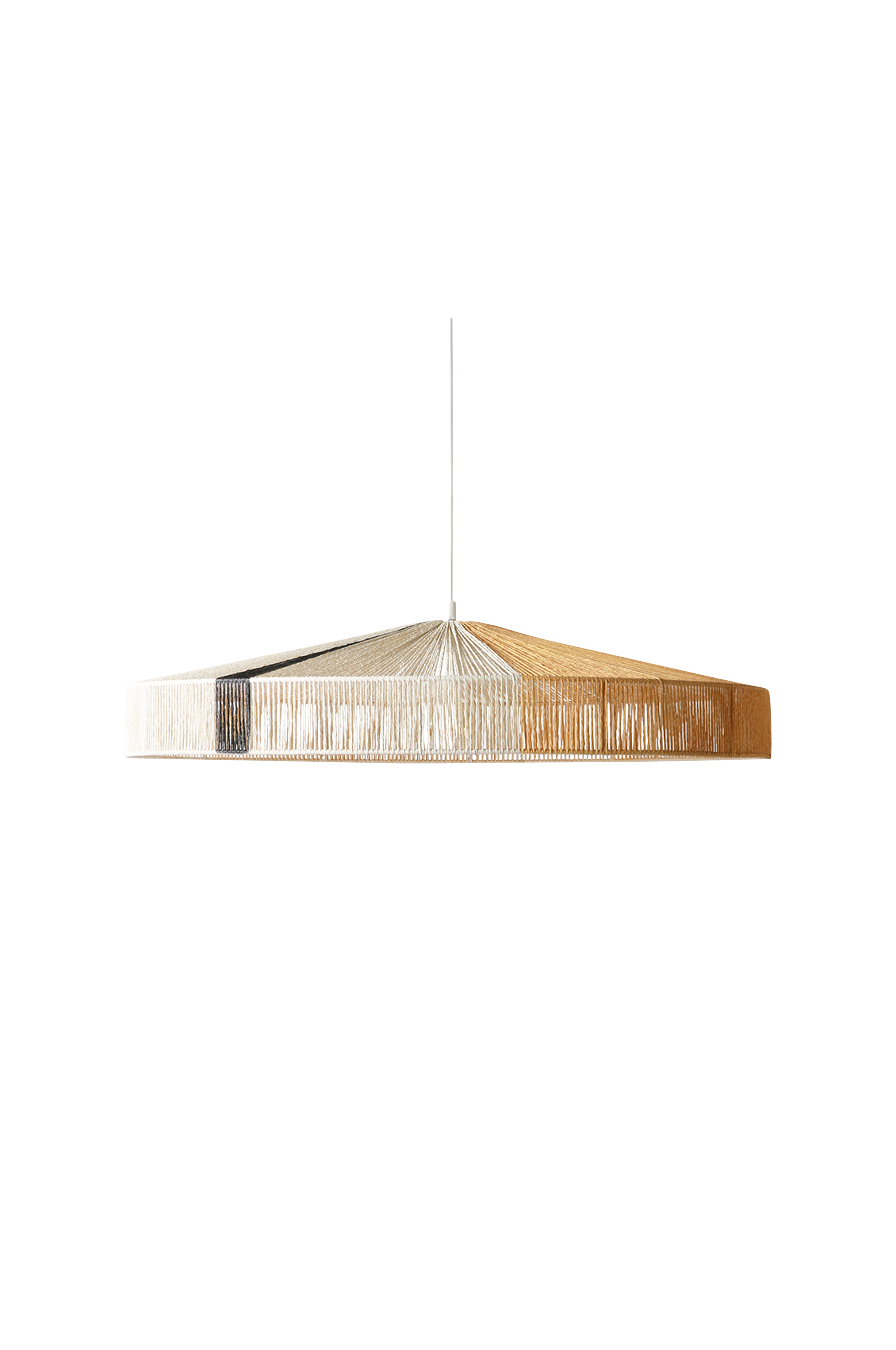Extraordinär och vacker taklampa i rep, med vit, gul och svart parti. Sladdlängd 220 cm, vit bomullssladd. Höjd 15 cm och diameter 70 cm. Takkopp i vit metall. Max 60W, dimbar. Ej jordad. Ljuskälla och takkontakt ingår ej.