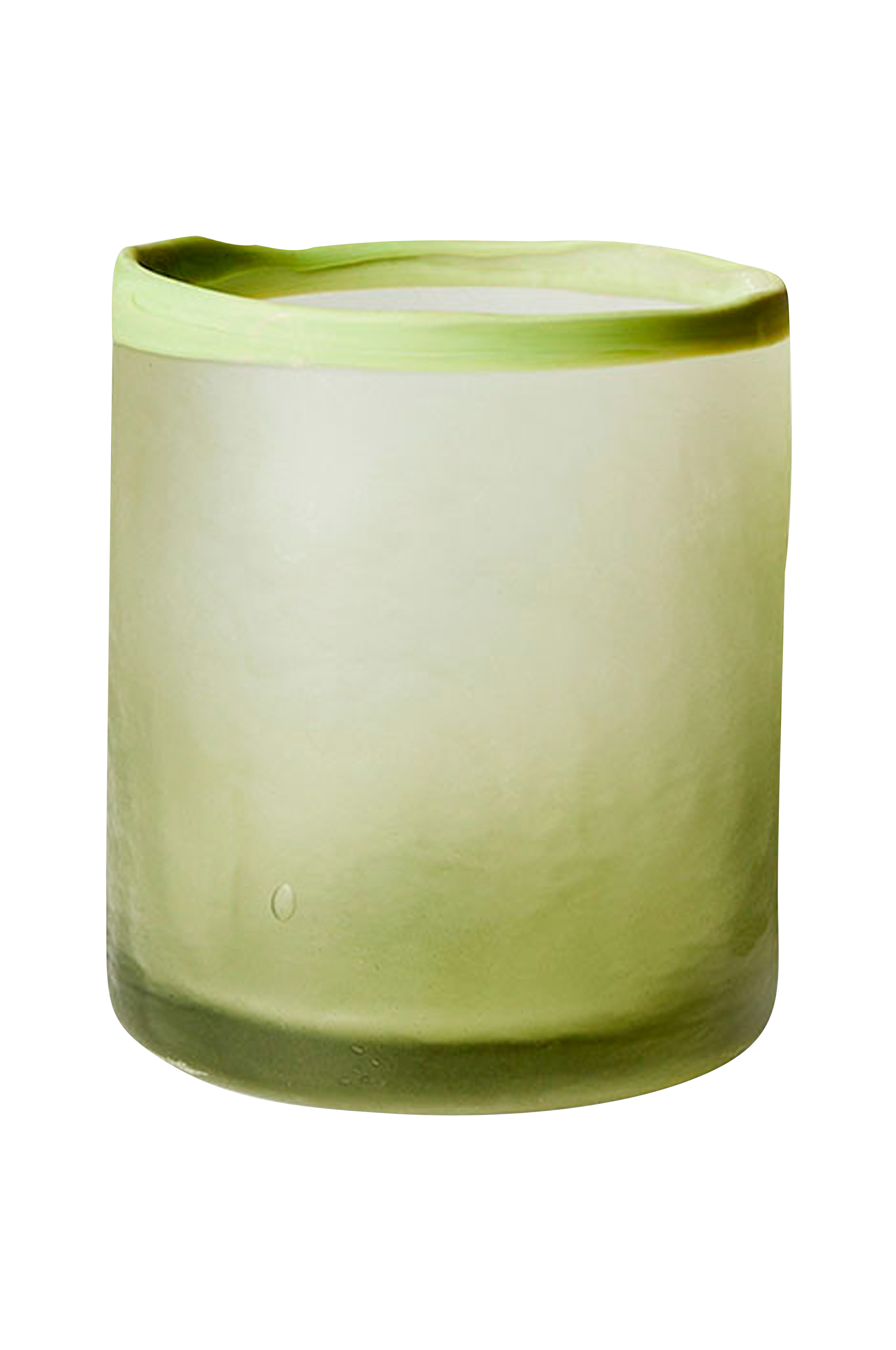 Lysestage i matteret glas med en malet kant ved åbningen. Eftersom den er håndlavet kan der forekomme en lille variation i størrelse og farve.