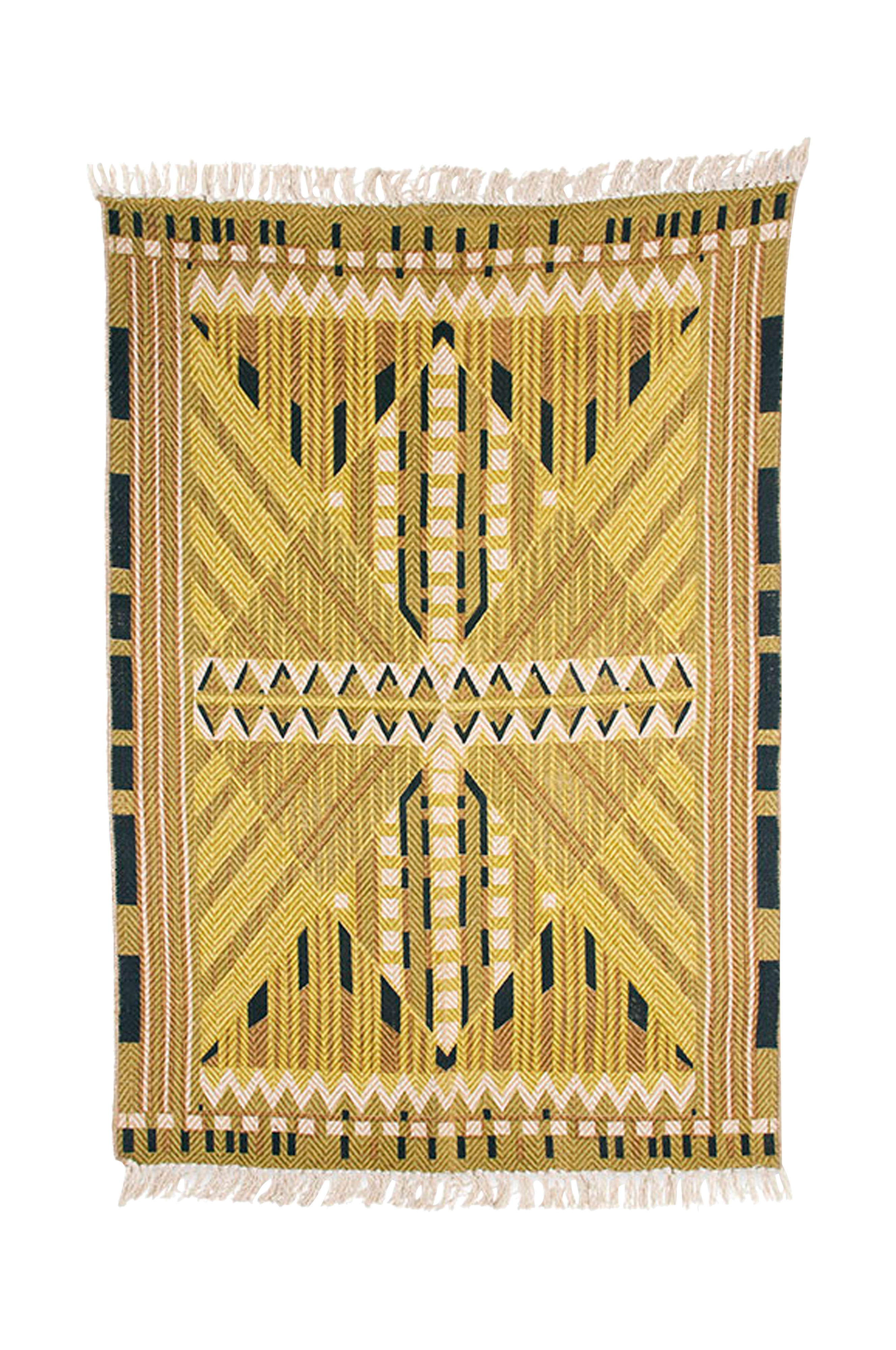 Mønstret tæppe med skridsikring. Leveres i målene 120x180 cm. Retroinspireret tæppe af bomuld, jutevæv og chevron.