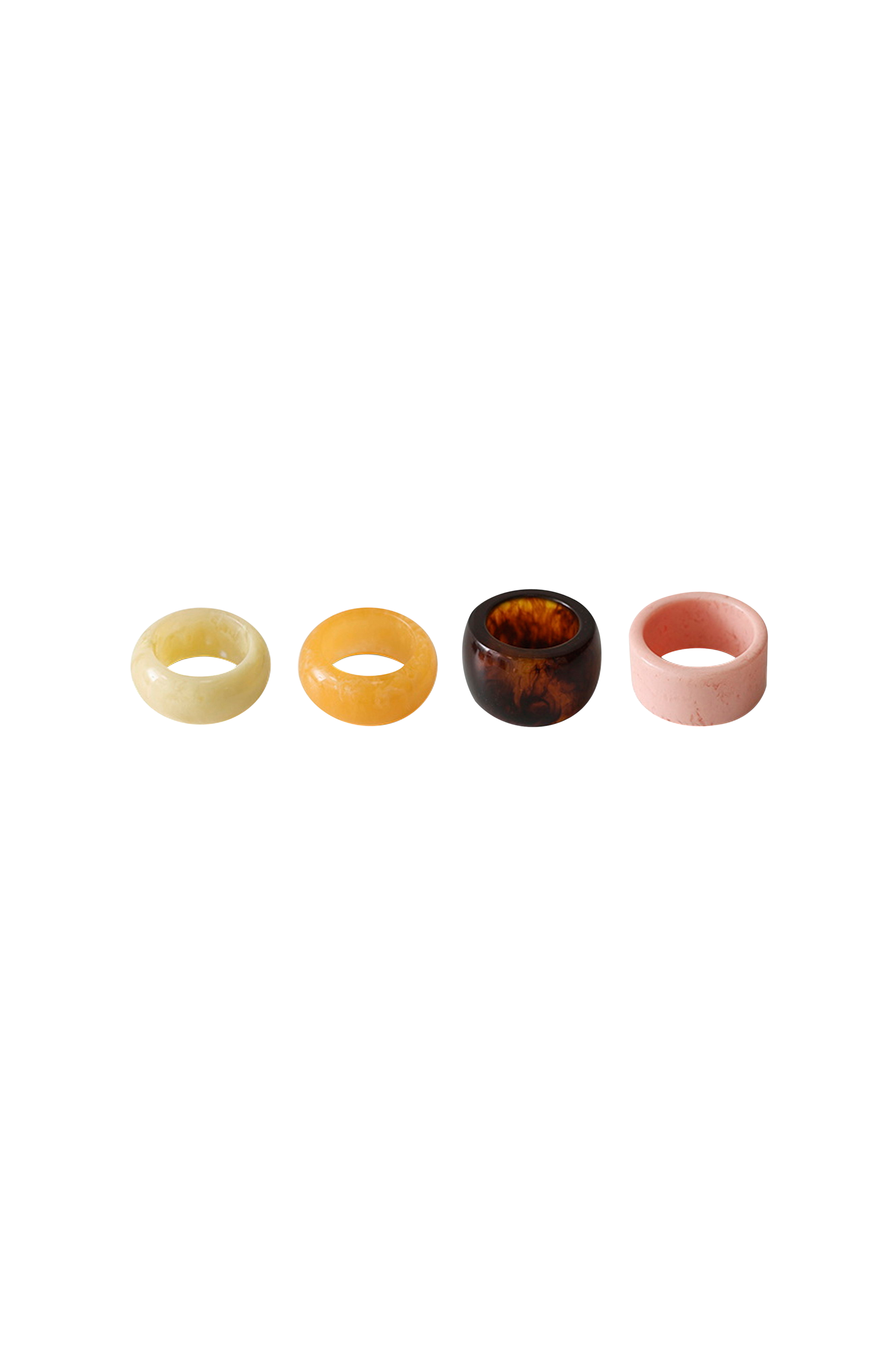 Dette sæt med fire servietringe forvandler hverdagen til noget skulpturelt. Hver ring har sin egen unikke form og farve, hvilket tilføjer personlighed og et strejf af moderne design til din borddækning. De er lette, men elegante, og er en lille detalje, der har stor visuel effekt. Materiale: Polyresin.