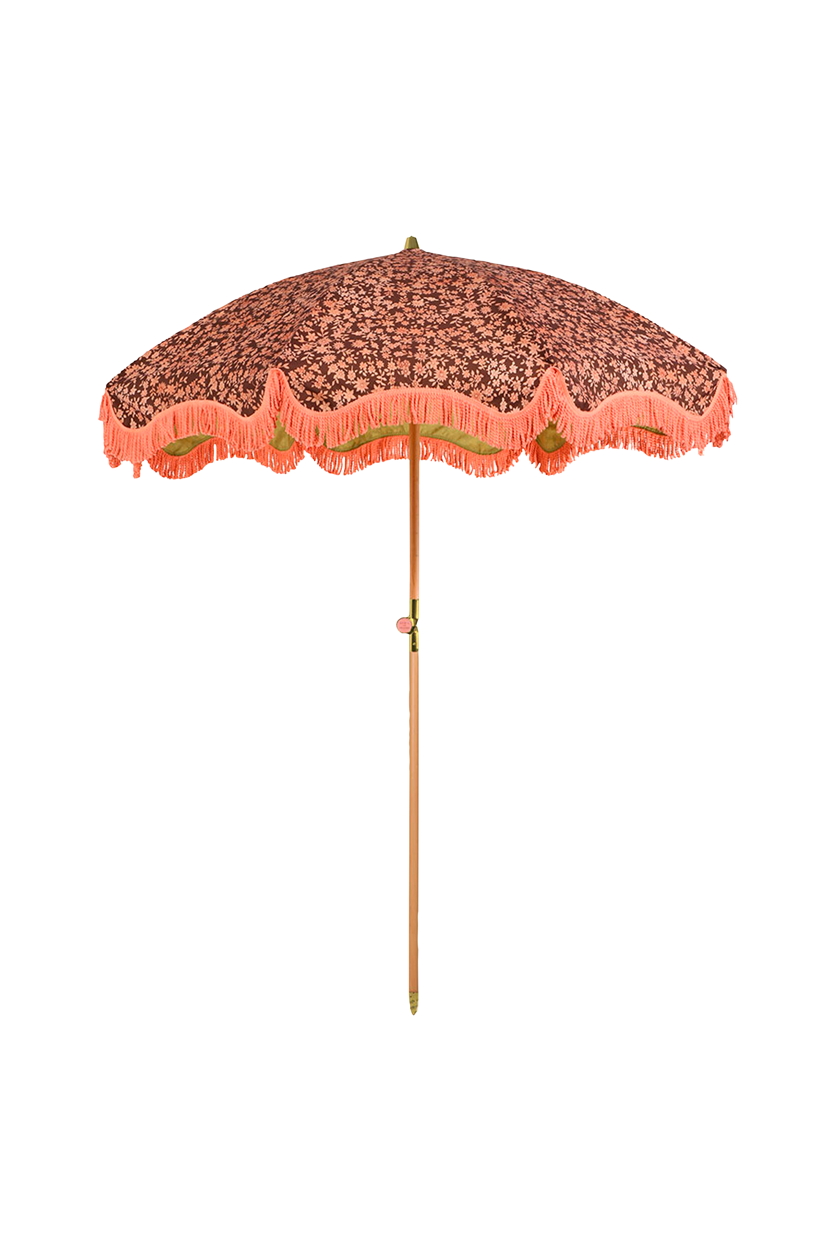 Blomstret strandparasol i koral og brun med vintage-look. Den er vintage-inspireret med kruseduller, funky farver og flotte mønstre. Denne blomstrede parasol er designet sammen med DORIS vintage. Inderside i sennepsgult blomstermønster og koralfarvede frynser. Størrelse 2 meter i diameter og højde 2,30 meter. Stang i bøg, wirer i stål, stof i polyester. Detaljer i metal med messingfinish. Parasollen kommer i matchende taske. Ikke vandafvisende. Når sæsonen er slut rengøres den efter brug. Lad den tørre helt inden den pakkes væk. Brug ikke parasollen i kraftig vind. Farven kan bleges over tid i direkte sollys.