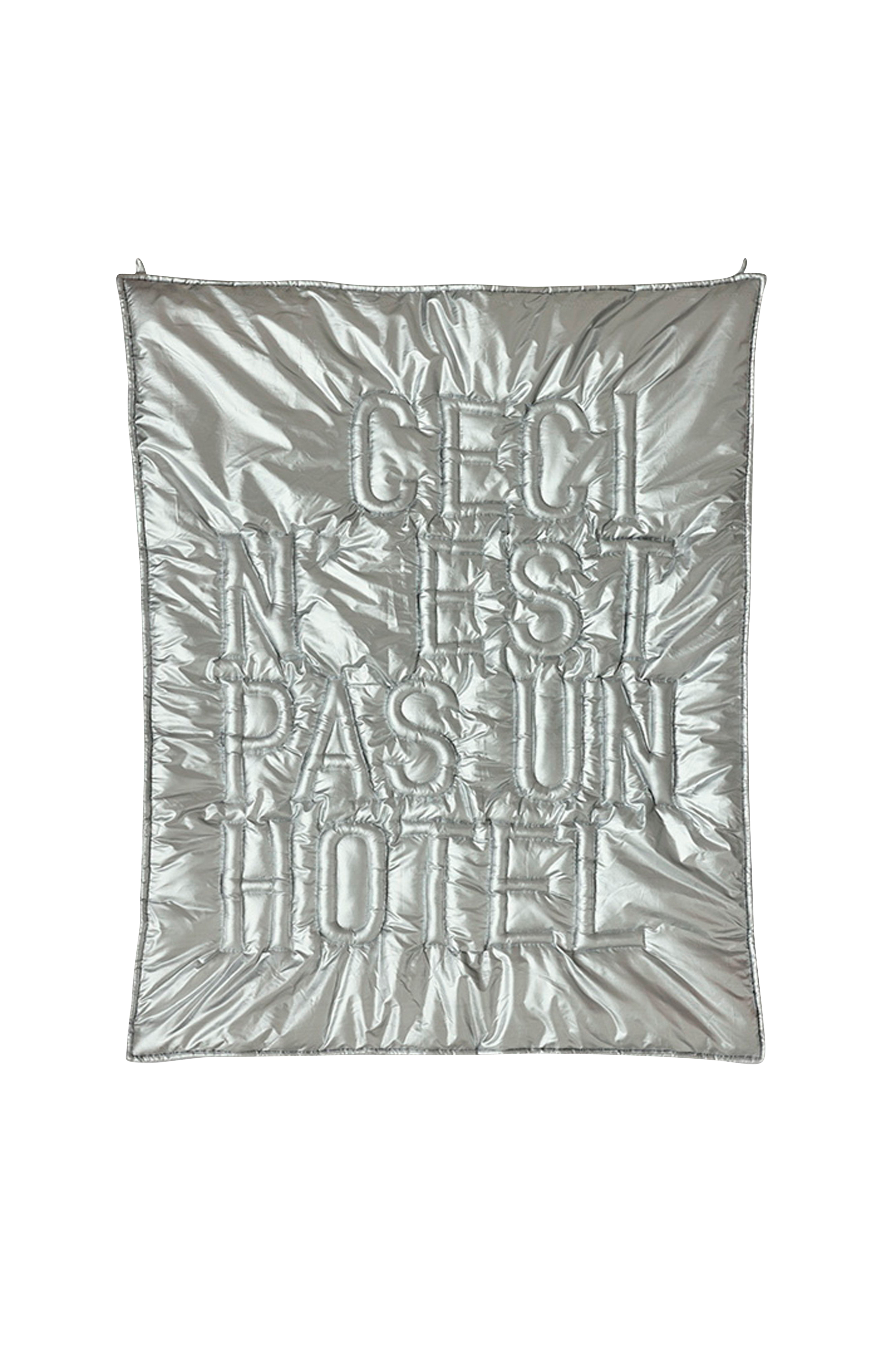 Dette vægdekorationsstykke er fremstillet af polstret tekstil i industriel sølvfarve og kombinerer dristig materialitet med grafisk præcision. Den broderede sætning – Ceci n’est pas un hôtel – af den hollandske kunstner Maaike Koster tilføjer en legende undertone, der balancerer kant med intention. Ikke skabt til at falde i med omgivelserne, men til at skille sig ud. Skabt til dem, der værdsætter kontrast og karakter, er det forankret i ånden af industrielt design, der afspejler den rå charme ved urbane lofts og er berørt af et strejf af fransk elegance. Nem at montere, øjeblikkeligt slående. Materiale: 100 % polyester.