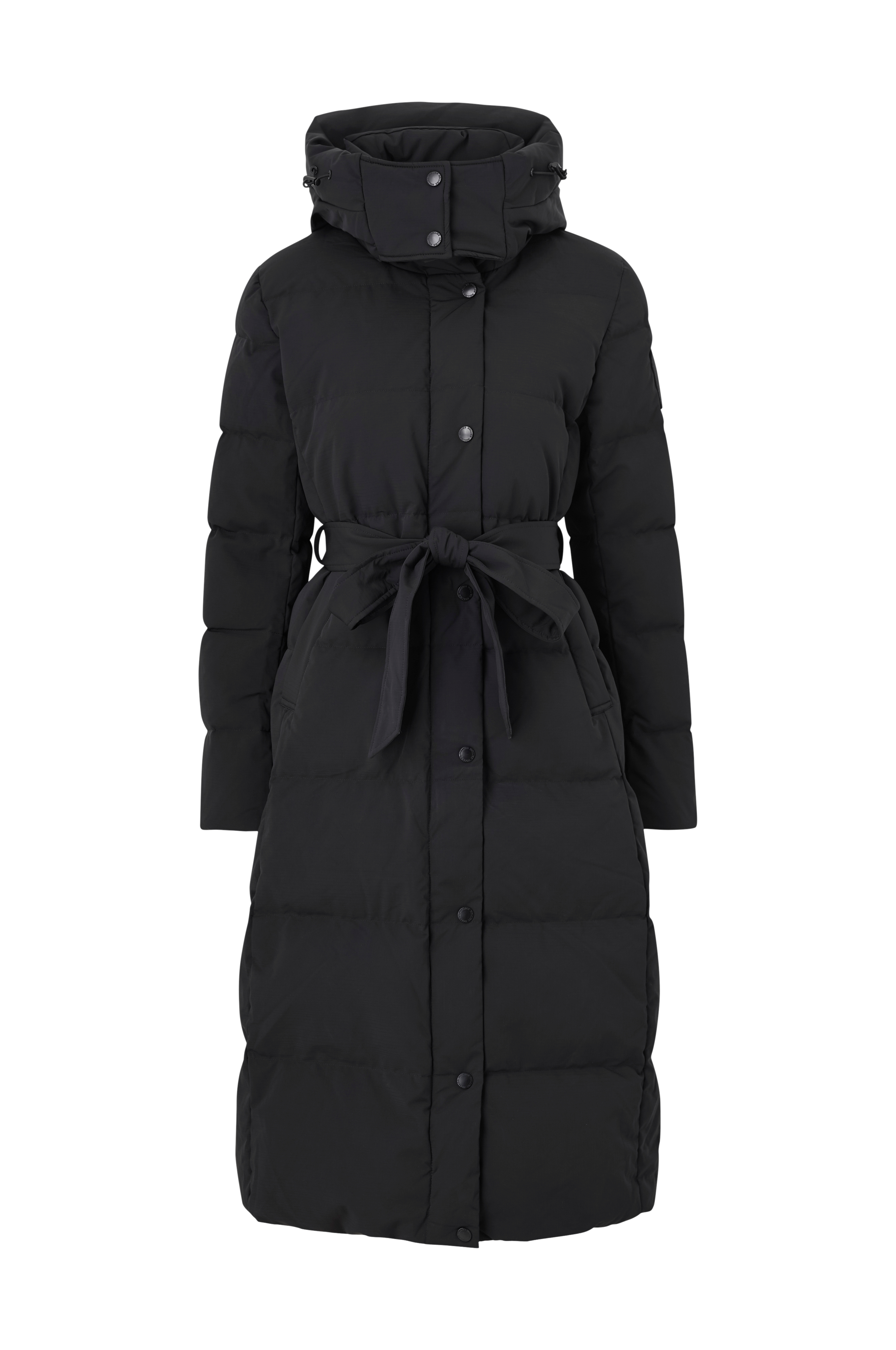 • Lang, foret jakke • Aftagelig, justérbar hætte • Skjult ribmanchet ved manchetterne • To-vejs lynlås • Vindflap med trykknapper foran • To åbne lommer med fleece for • Aftageligt bindebælte ved taljen • Vævet, glat for • Længde: 115 cm i størrelse 36