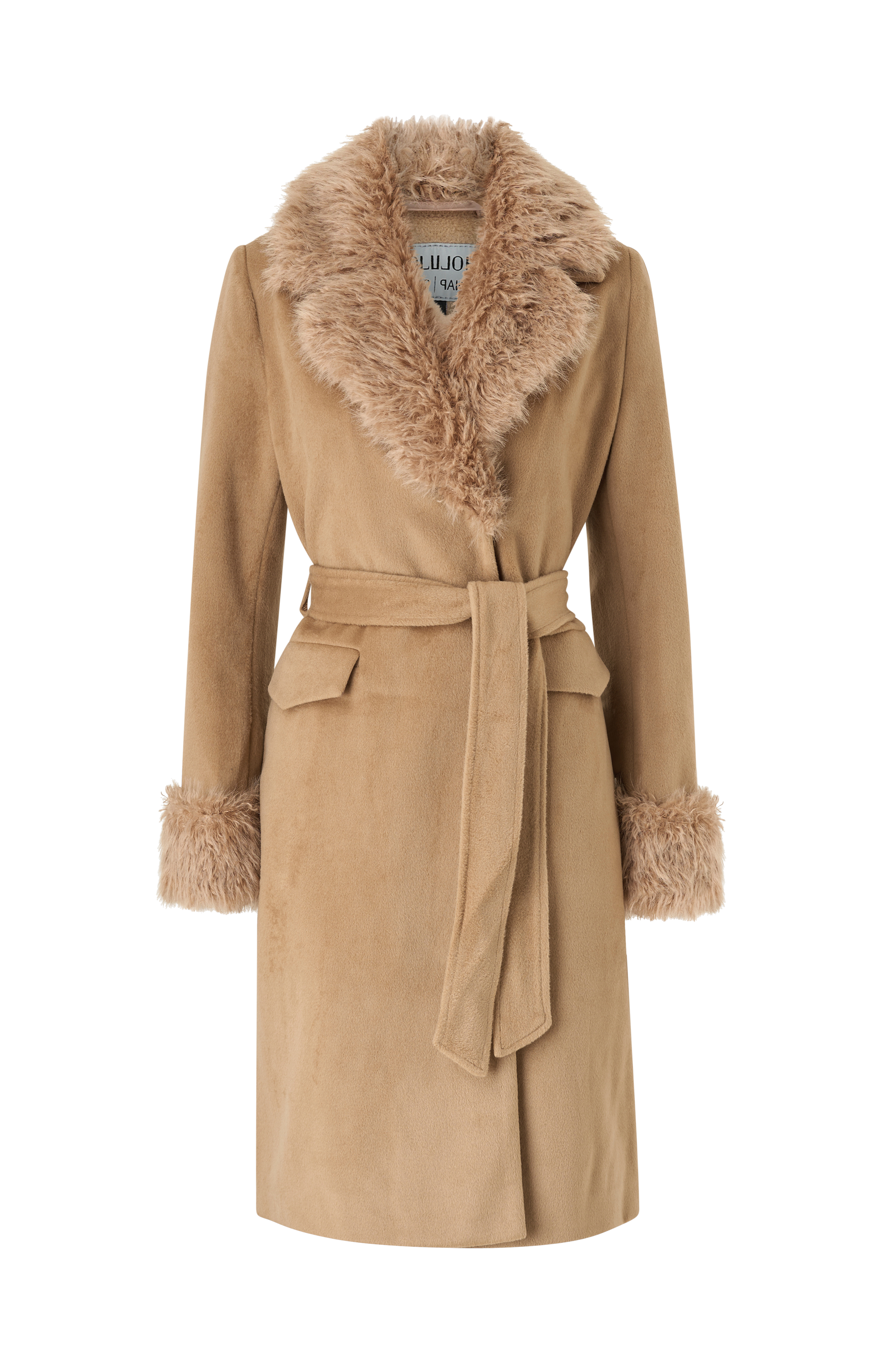 • Frakke med aftagelig kunstig pels på kraven og ved ærmeafslutningerne• Bindebælte ved taljen• Knaplukning• Tekstilforing• To paspolerede lommer• Normal pasform• Længde: 100 cm i størrelse 36