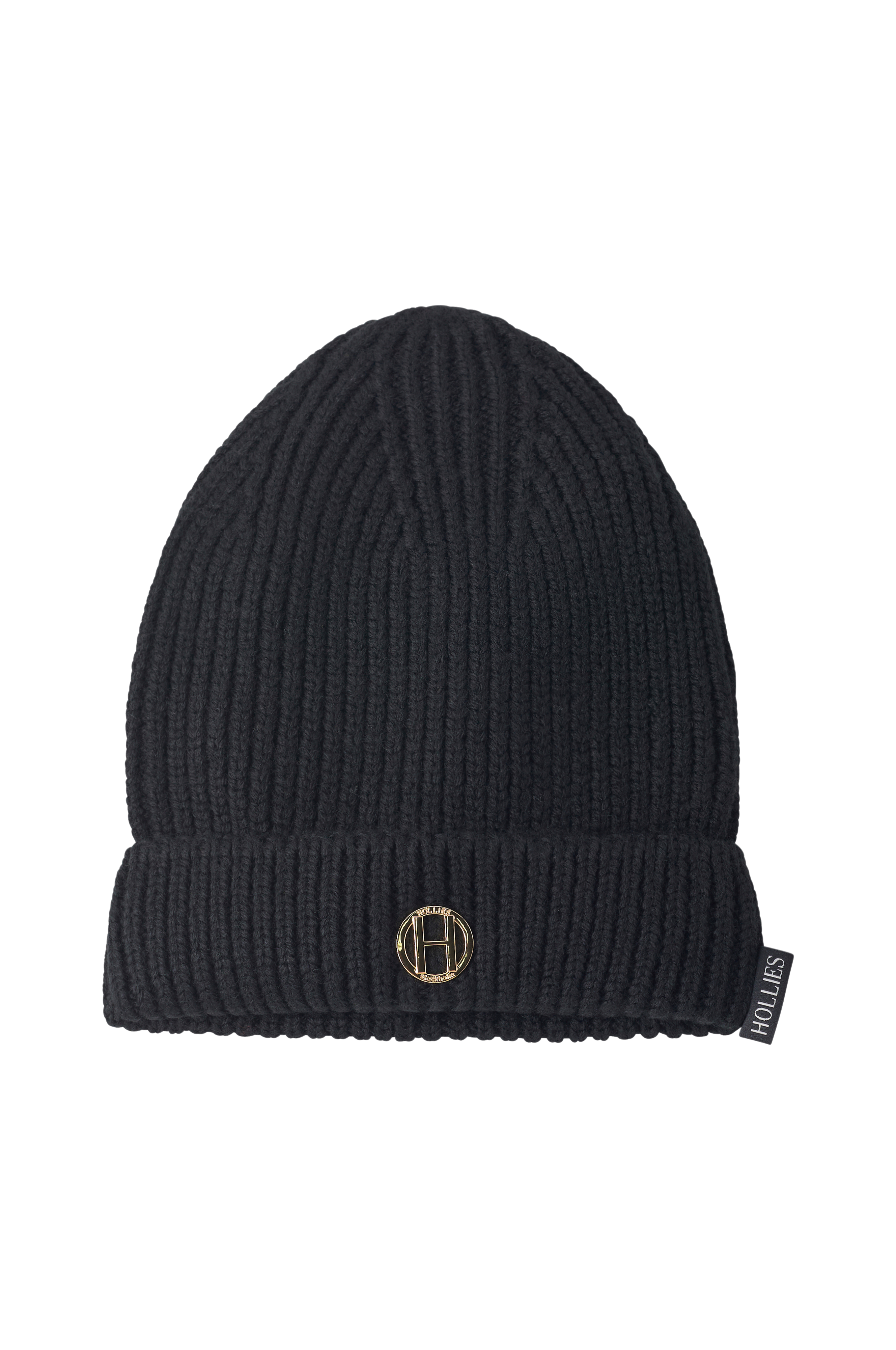 • Ribstrikket hue i uldmiks• Foldet søm med guldfarvet metallogo