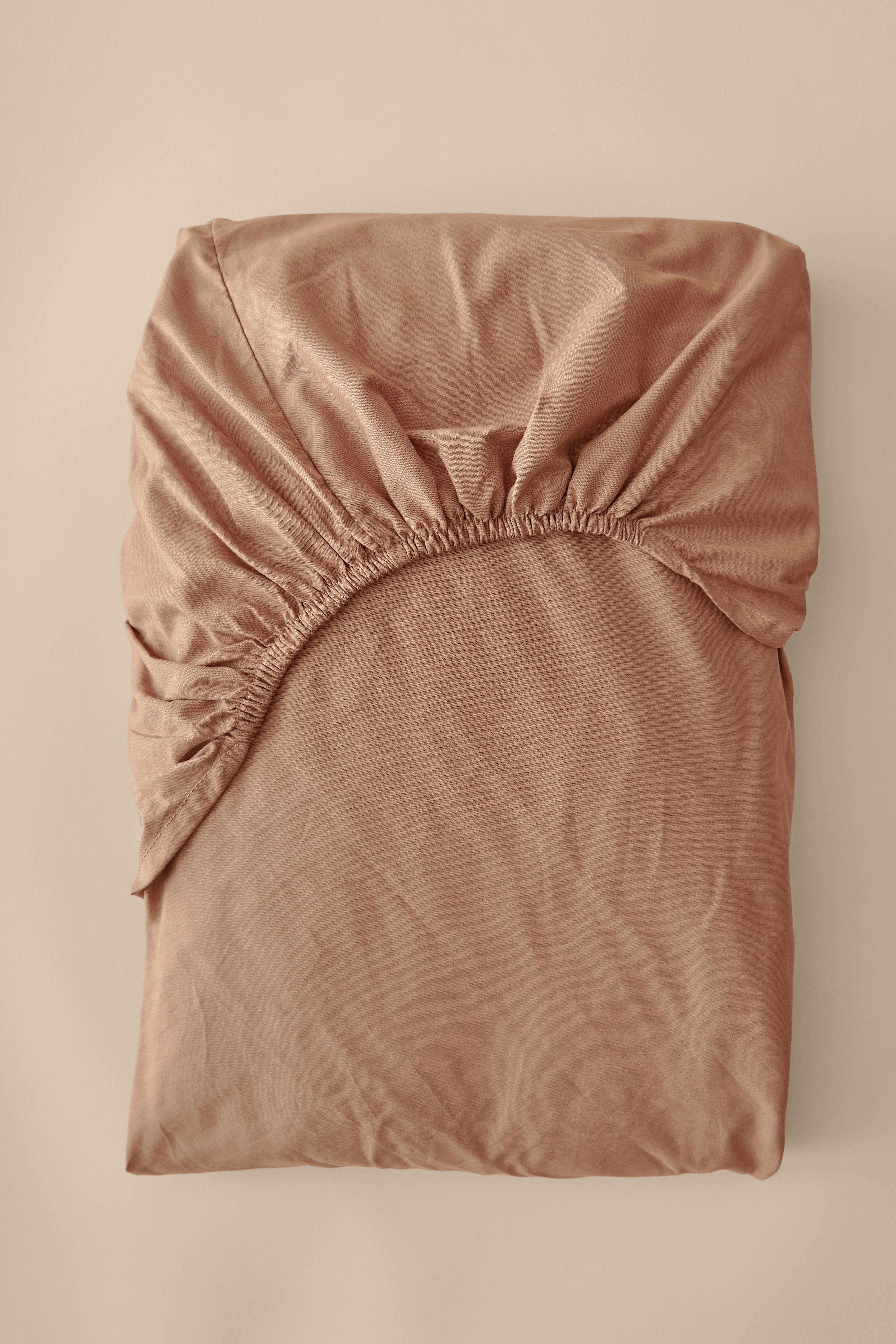 Faconsyet lagen i blød bomuld. Trådtæthed 144 TC. Elastikbånd i hjørnerne. Hjørneelastik 25 cm. Passer til madrasser op til 10 cm.