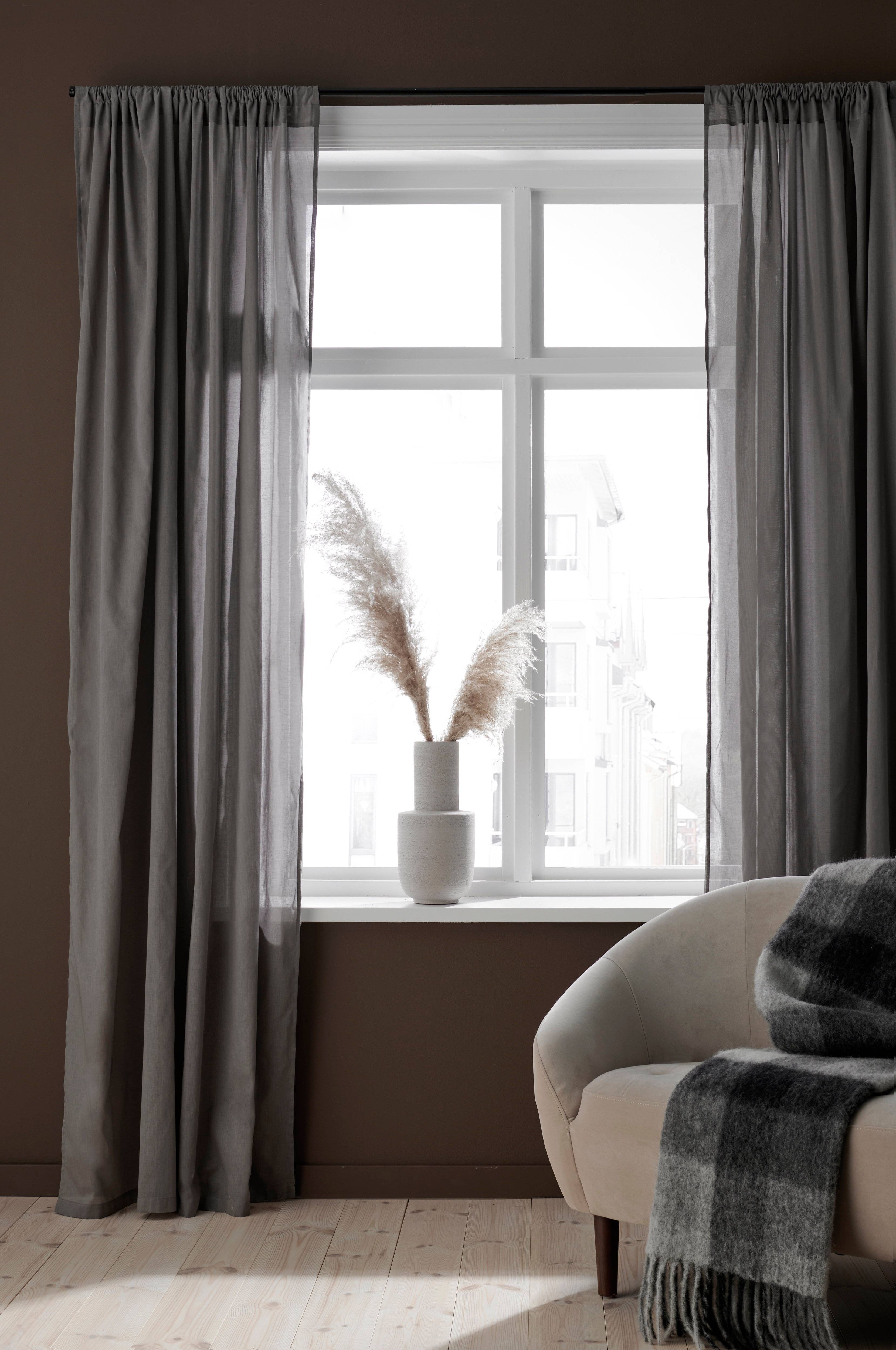 To gardiner i luftig voile af bomuld. Syet løbegang foroven. Bredde 145 cm. Tre længder: 160, 220 og 250 cm.