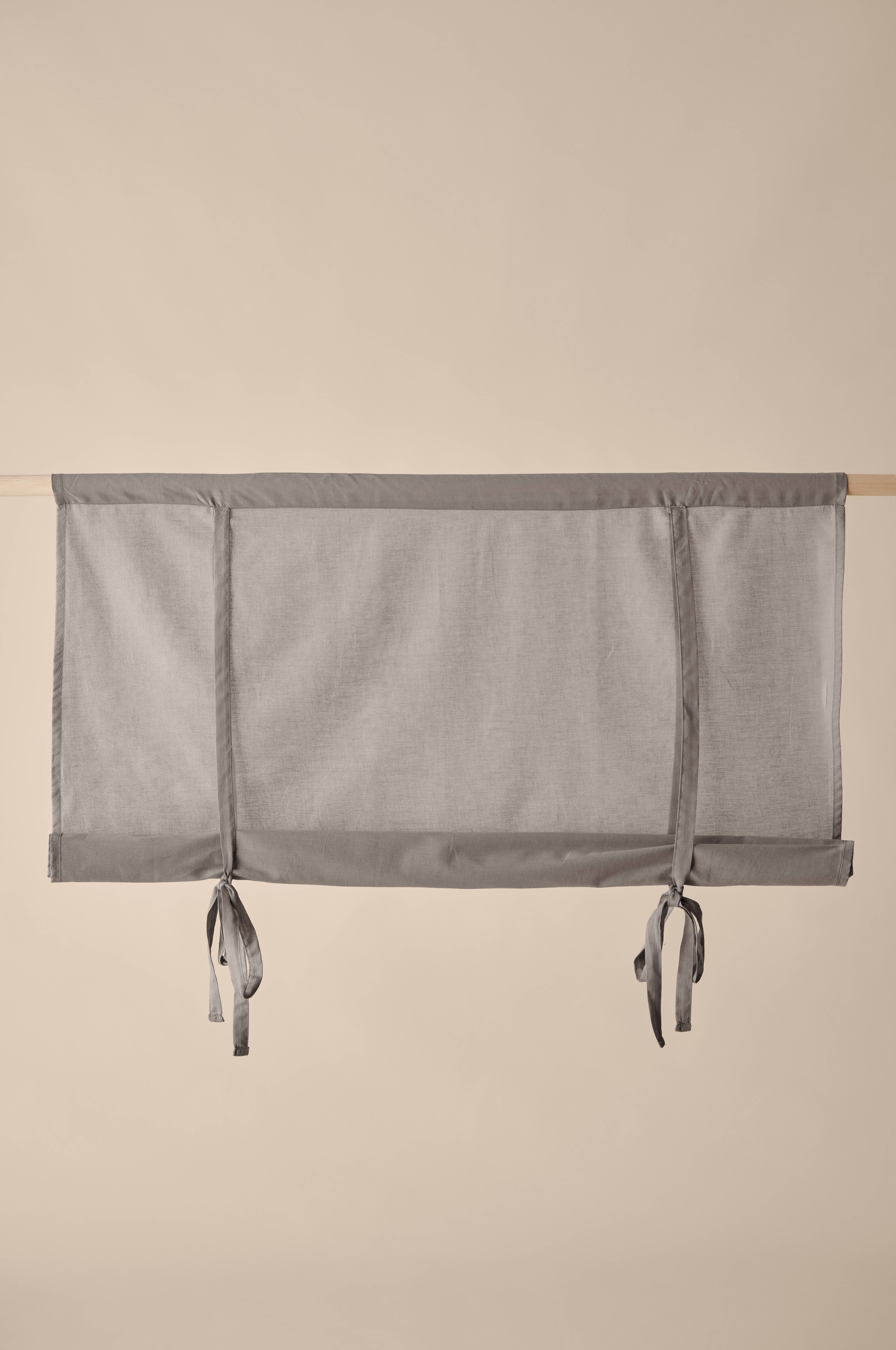 Af bomuldsvoile med løbegang foroven (trædes på gardinstangen). Rulles op med to bindebånd. Længde 100 cm. Findes i fire bredder: 80, 100, 120 og 140 cm.