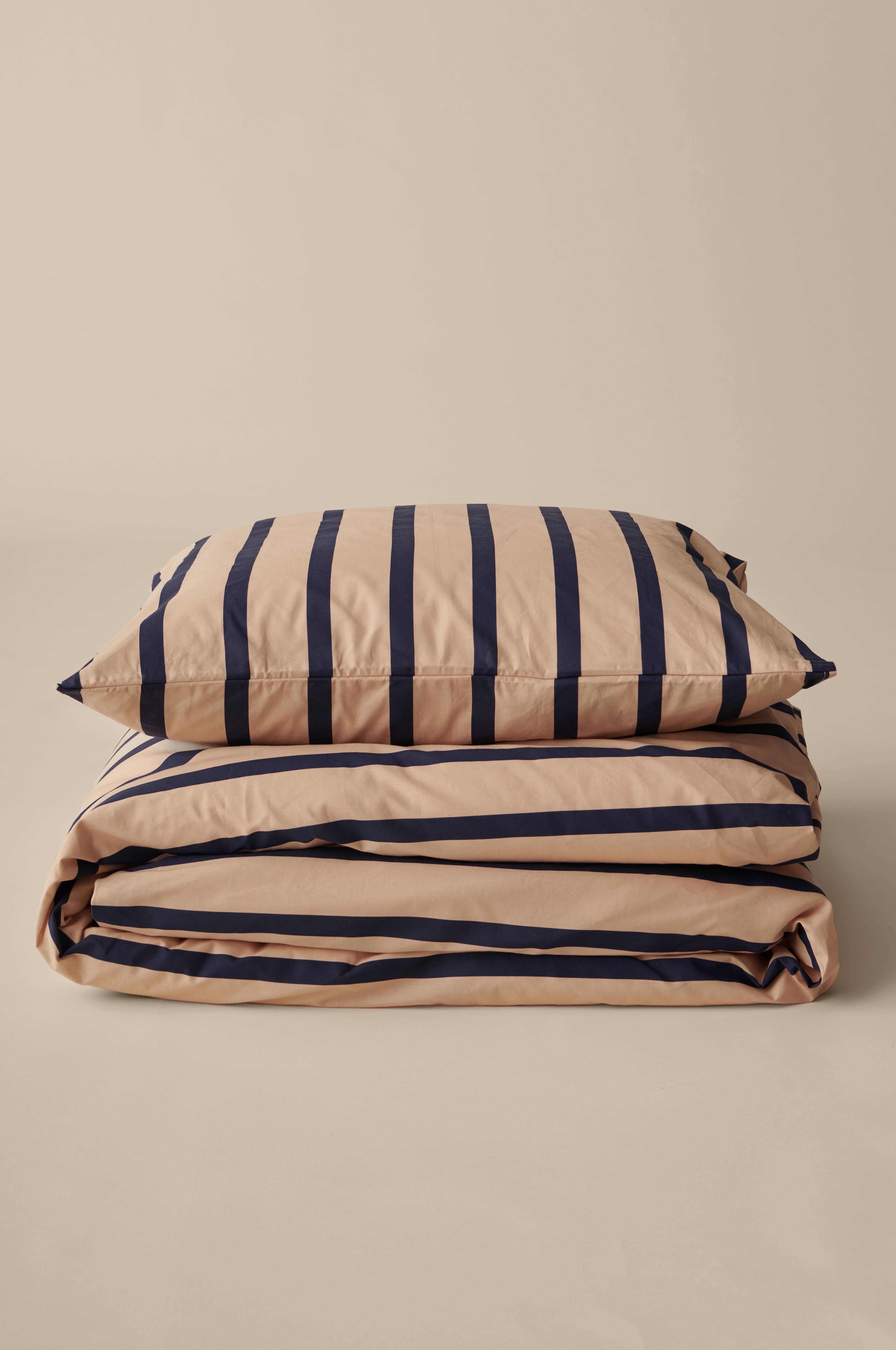Sengesæt i bomuld med printede striber. Trådtæthed 144 TC. Dynebetræk med huller i siden til brug ved opredning. Trykknapper i kanten forneden. Sættet leveres i en stofpose i samme kvalitet.