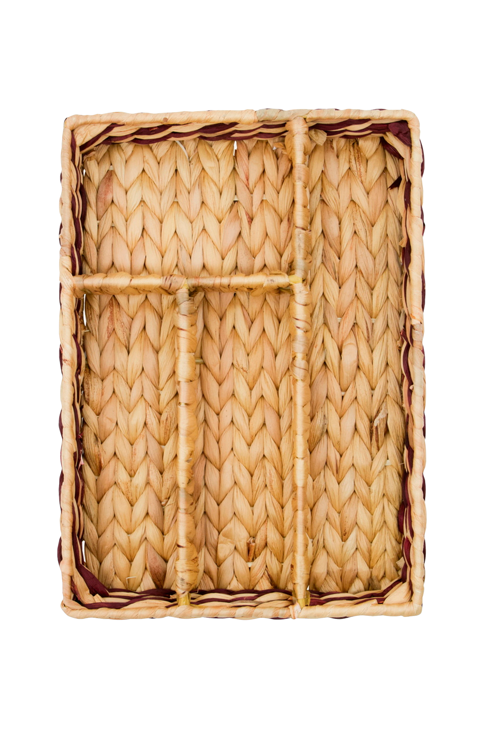 En håndvævet organiseringsbakke i vandhyacint med fire rum, perfekt til at holde orden på mindre ting. L 35 cm, b 25 cm, h 6 cm.