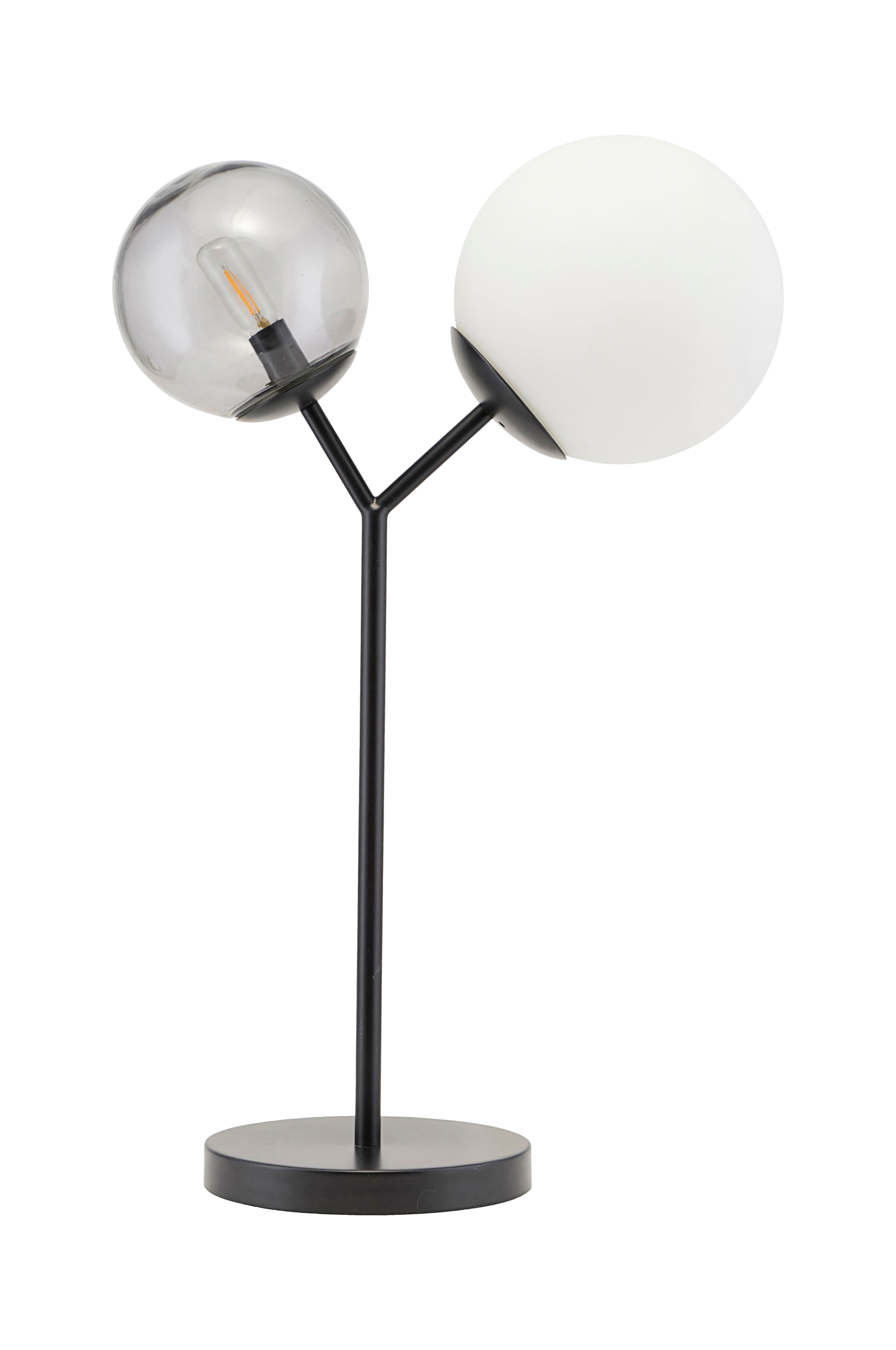Twice fra House Doctor er en smuk og dekorativ bordlampe, der passer ind i de fleste hjem. Som navnet antyder, har lampen to kugler - en i sort glas og en i hvidtonet glas. Foden er i sort jern og kombinationen af de to materialer giver en rå, maskulin og dekorativ lampe. Brug den på en kommode, et lille sidebord i stuen eller i soveværelset. Twice har en højde på 42 cm og skal bruge en E14-pære på maks. 40 W. Lad lampen være en dekoration i hjemmet, der skaber en hyggelig atmosfære. Dette produkt er håndlavet, hvilket betyder, at der kan forekomme en vis variation i farve, størrelse og form. Tørres af med en tør klud.