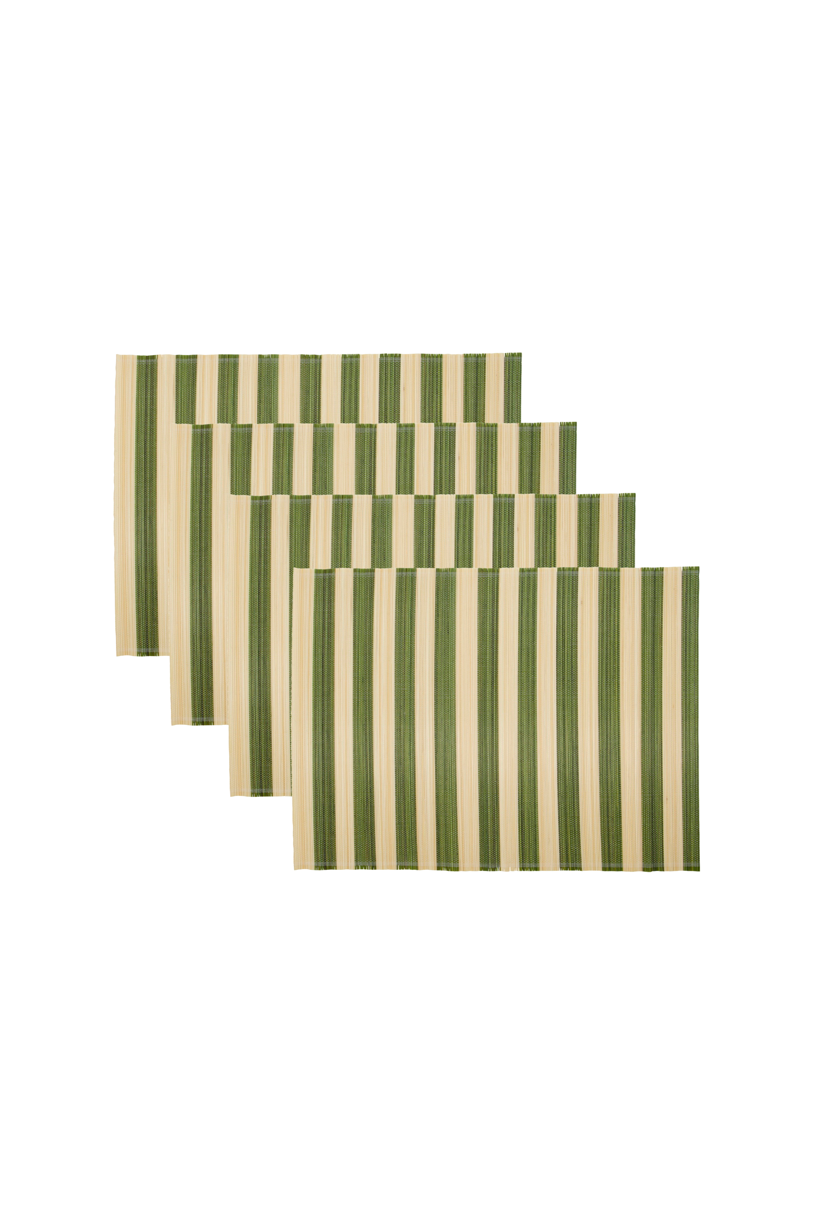 Giv din spiseplads en naturlig charme med disse håndlavede bordskånere. De er fremstillet af en blanding af bambus og bomuld og har tidløse striber i grøn og råhvid. Dette sæt med fire måtter giver et perfekt strejf af farve og elegance til din borddækning og gør hvert måltid til en stilfuld affære. Håndlavet bambus og bomuld. Forbedrer bordets æstetik. Tilføj en levende accent til dit spisebord.