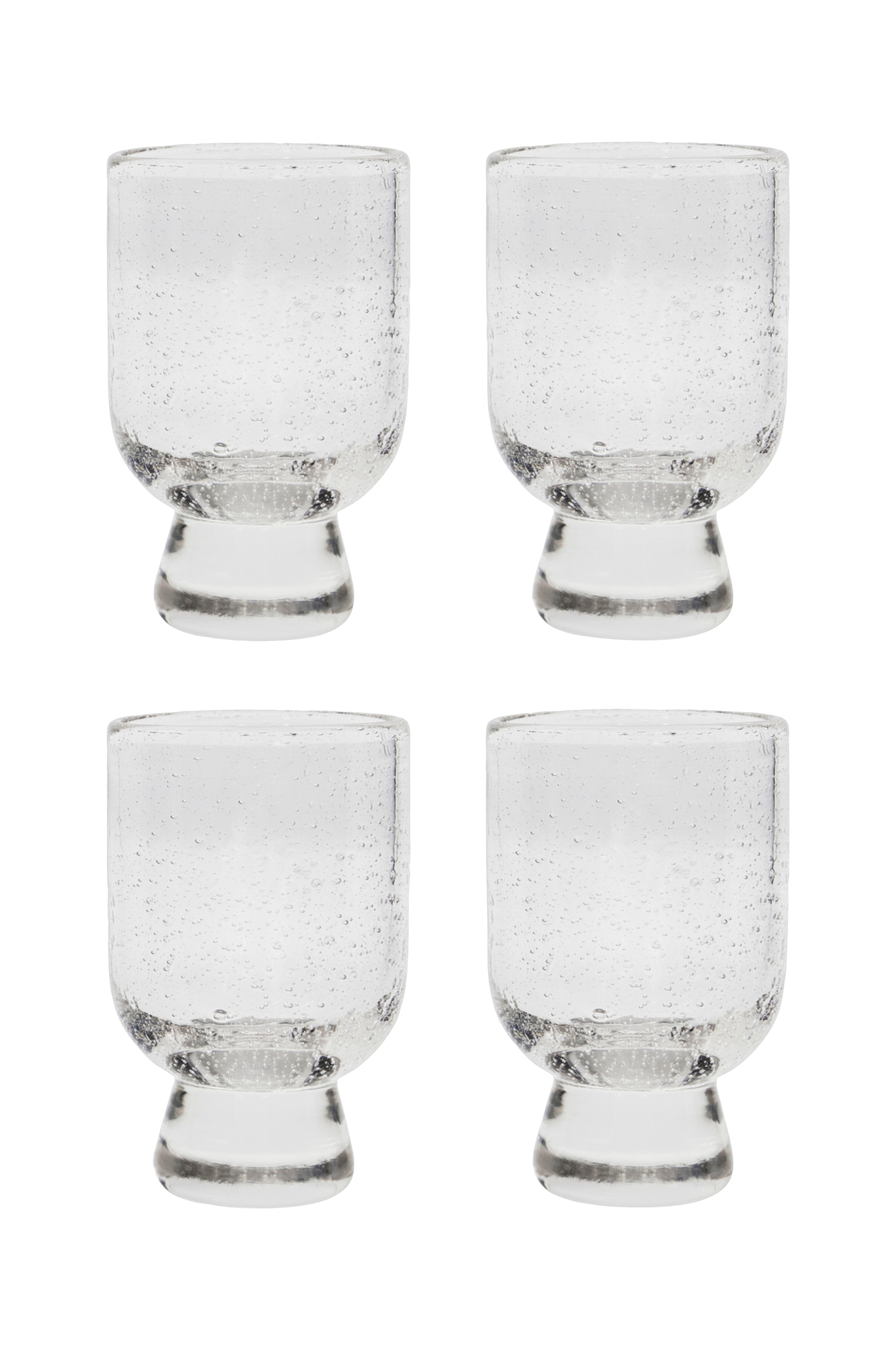 Dette sæt med fire klare glas kombinerer en legende bobletekstur med mundblæst kunst for et design, der skiller sig ud på ethvert bord.