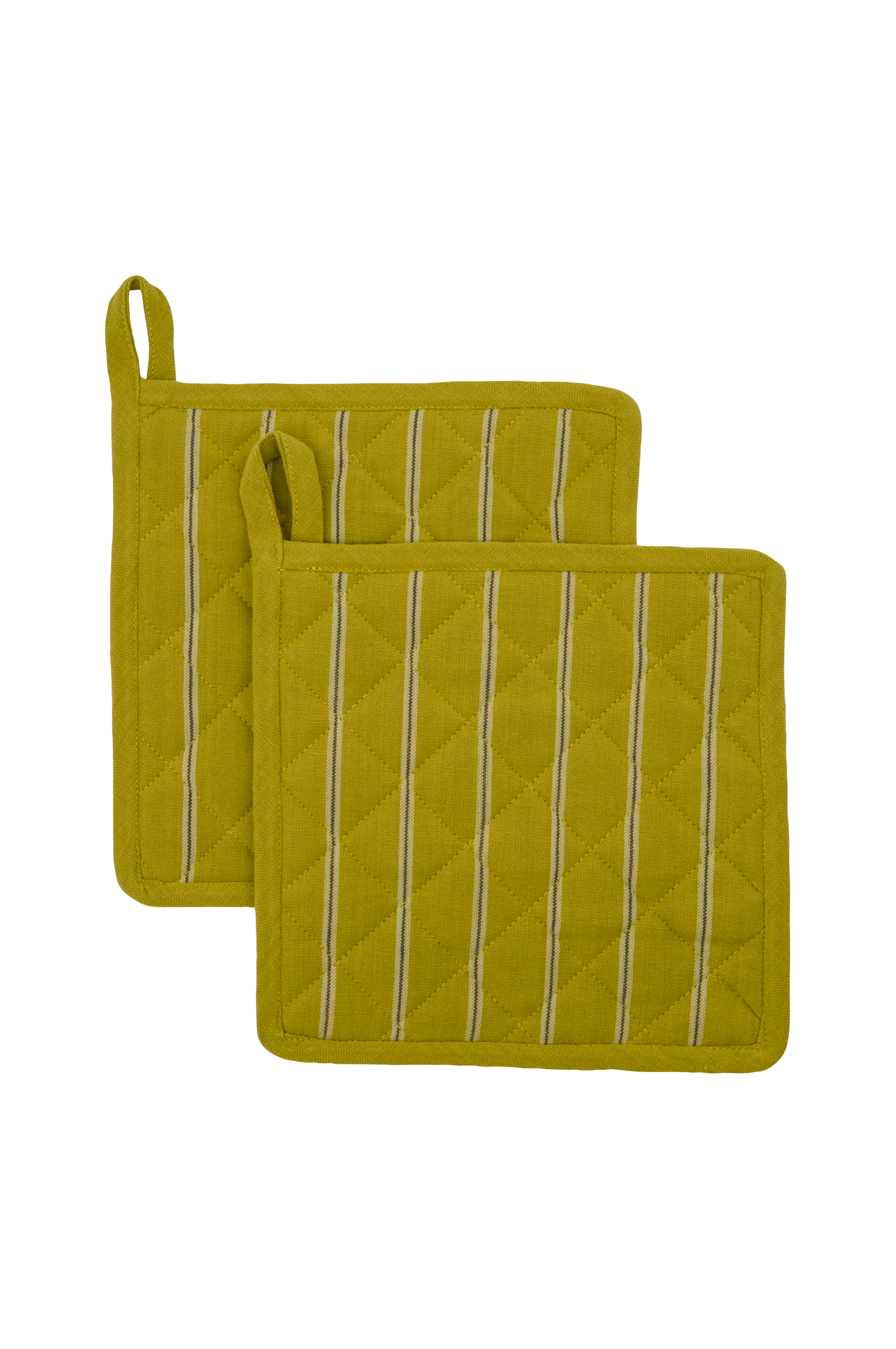Giv dit køkken en tidløs stil med dette sæt med to sennepsfarvede grydelapper. Den markante sennepsfarve suppleres smukt af smalle striber i råhvid og sort, hvilket giver et klassisk og alsidigt design. Grydelapperne er fremstillet af 100 % bomuld og har en tyk, quiltet tekstur, der giver overlegen varmebeskyttelse. De er perfekte til hverdagsbrug og kombinerer praktisk funktion med et elegant udseende, der forbedrer dit køkkens æstetik. Sæt med 2 stk. Tyk quilt for beskyttelse. Tilføj et stilfuldt touch til dine køkkenredskaber.
