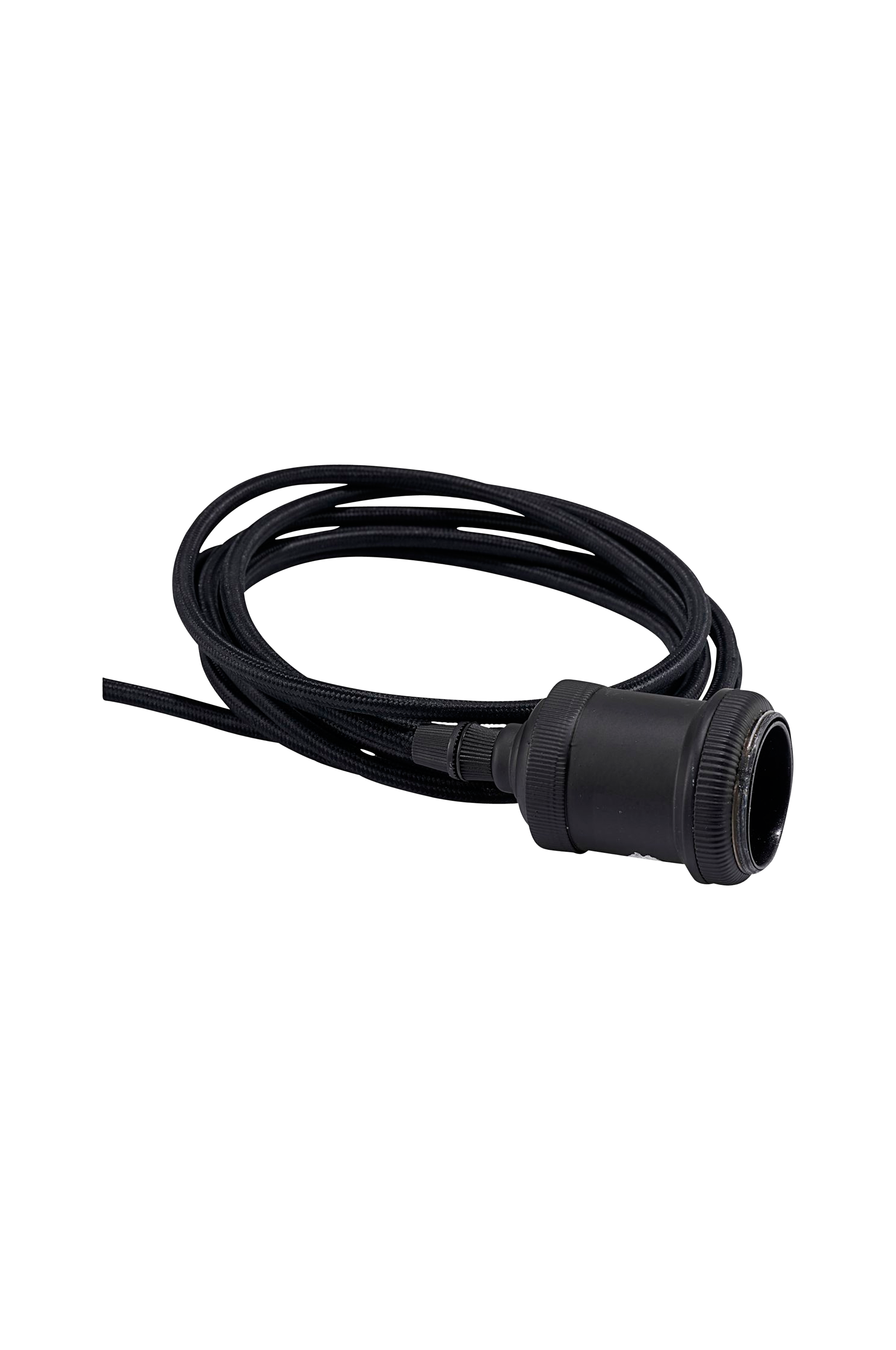 Loftlampe/lampeledning fra House Doctor med 3 m sort stofledning og sokkel i jern. Kan anvendes alene eller med valgfri skærm. E27-sokkel. Maks. 40 W. Pære medfølger ikke. Kontakt medfølger ikke.