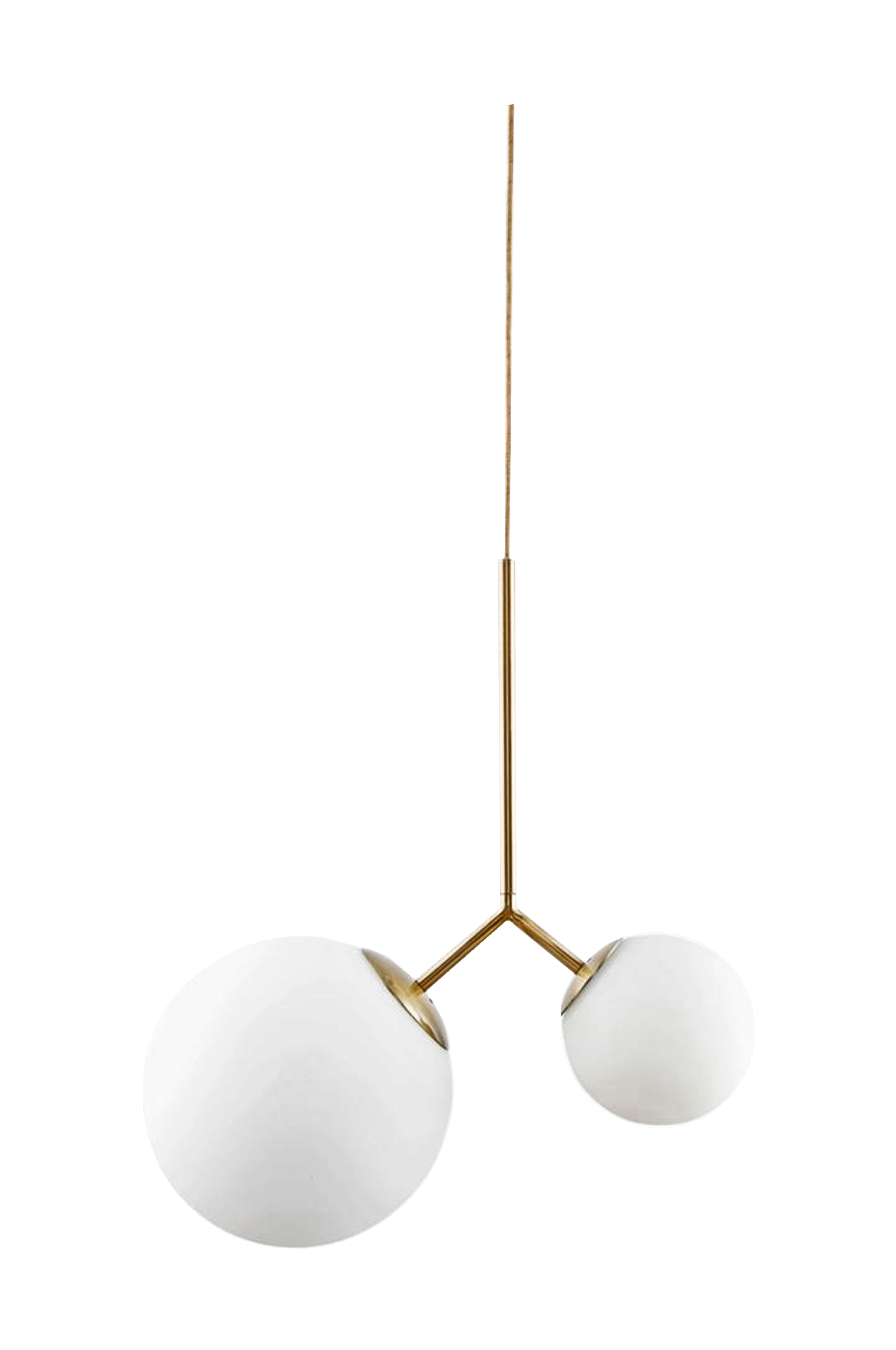 Lamper er vigtige elementer, når du vil skabe en personlig og stemningsfuld indretning. Med Twice fra House Doctor får du en smuk loftlampe med et elegant og fint udtryk. Lampen har et smukt asymmetrisk design, der tilføjer indretningen karisma og alsidighed. Med sine messingdetaljer har lampen et utroligt fint udtryk, der er både råt og klassisk på samme tid. Den kan bruges i de fleste rum i boligen - lad fantasien få frit spil. Brug den i entreen, over spisebordet eller i et hjørne af stuen og skab et vidunderligt og unikt look i indretningen. Dette produkt er håndlavet, hvilket betyder, at der kan forekomme en vis variation i farve, størrelse og form. Mål: Højde: 70 cm og med 3 meter ledning. E14, 40 Watt pr. fatning. Håndlavet glaskugle/Metal.