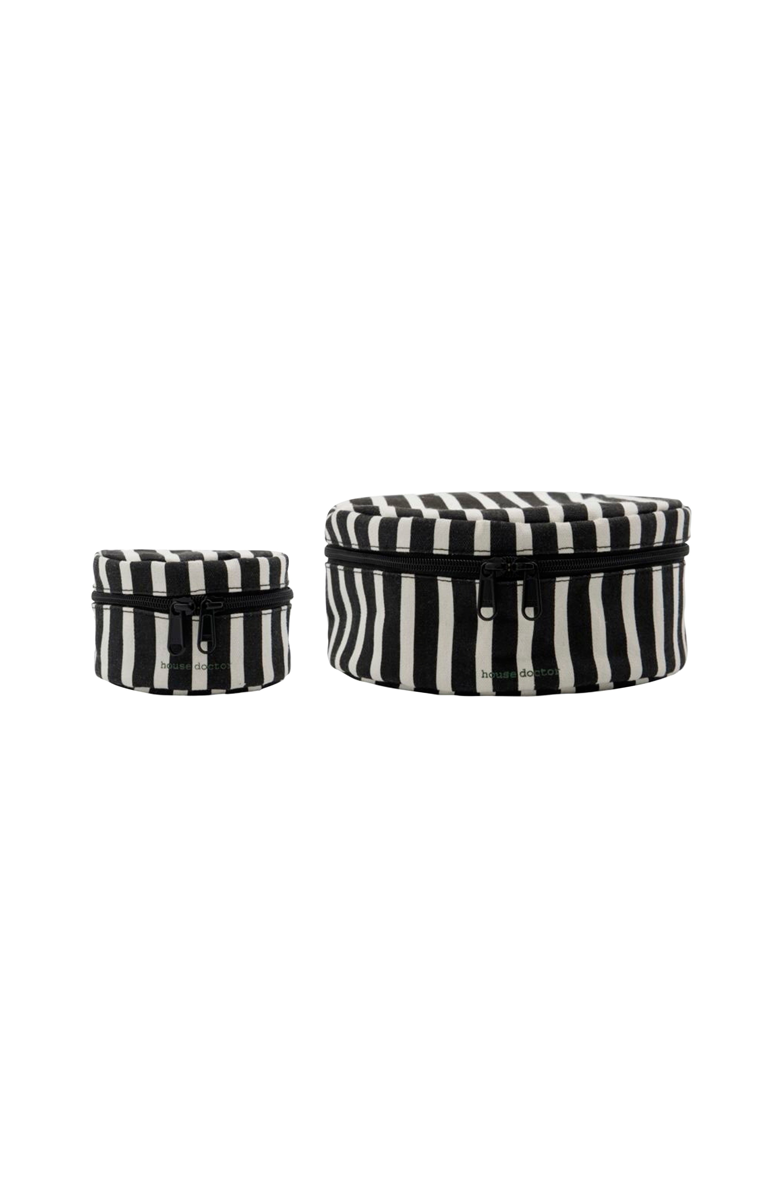 Løft din organisation med det elegante design af disse sort- og råhvidstribede opbevaringsbokse. De er fremstillet af slidstærkt bomuldslærred og har alle en sikker lynlåslukning og er perfekte til at beskytte en række forskellige ting, samtidig med at de tilføjer et strejf af elegance til dit rum. Løft din organisationsstil med disse smarte opbevaringsbokse. S:, h: 7 cm, dia: 11 cm. L:, h: 9 cm, dia: 20 cm. Materiale: 50 % bomuld, 50 % polyester, 100 % polyethylen (coating).