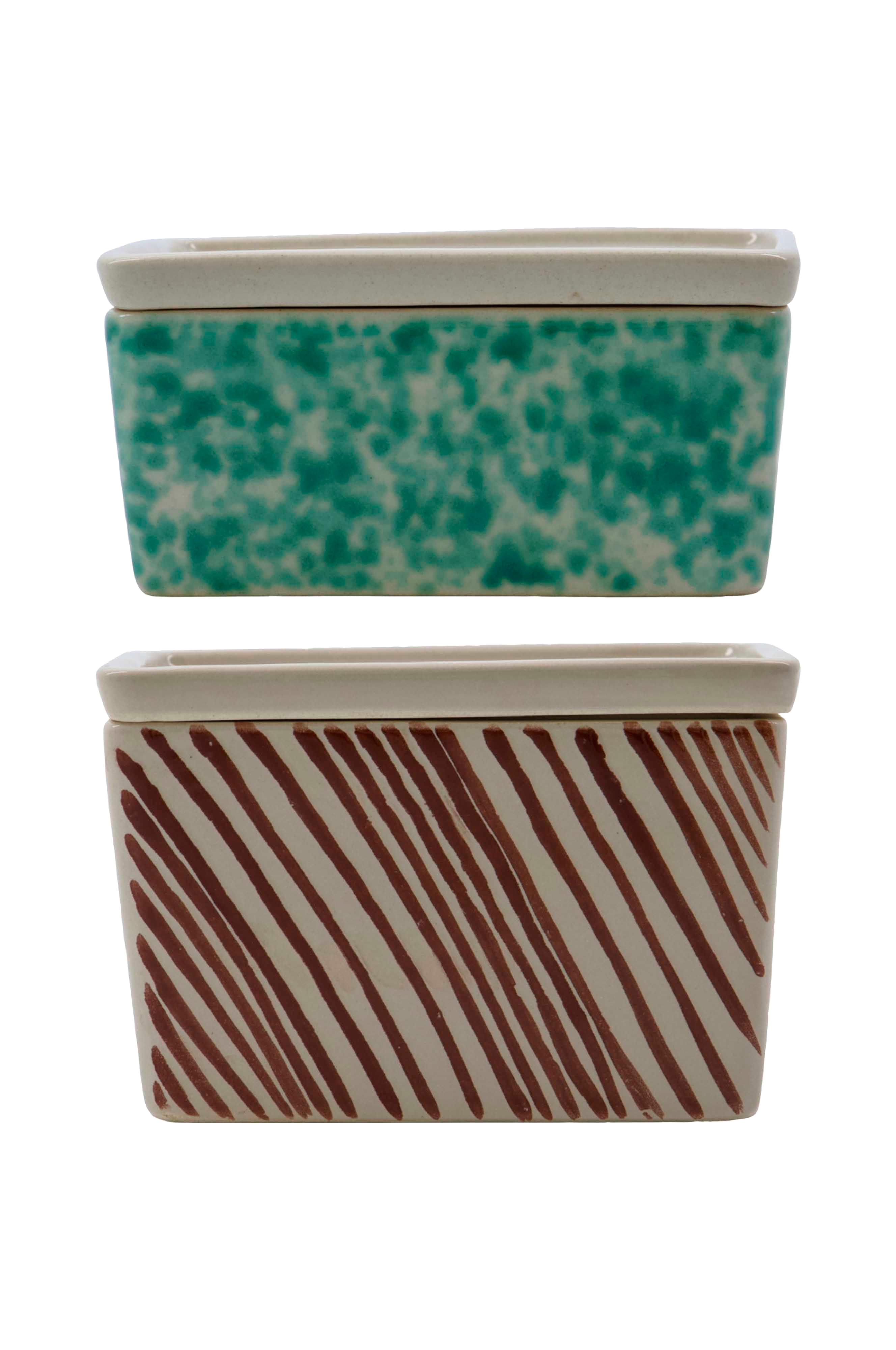 Tilføj et strejf af kunst til dit køkken med dette sæt opbevaringsbokse i stentøj. Hvert stykke er unikt håndmalet, den ene med striber og den anden med et stænkmønster. Æskerne er designet til at kunne stables og er både praktiske og et dekorativt element på spisebordet. De er ideelle til opbevaring af smør, snacks eller grøntsager i mundrette størrelser og forener funktionalitet med stil. Unikt håndmalet design. Kan stables for nem opbevaring. Ideel til snacks eller smør. Tilføj disse alsidige kasser til dit køkken for at få et farverigt touch!