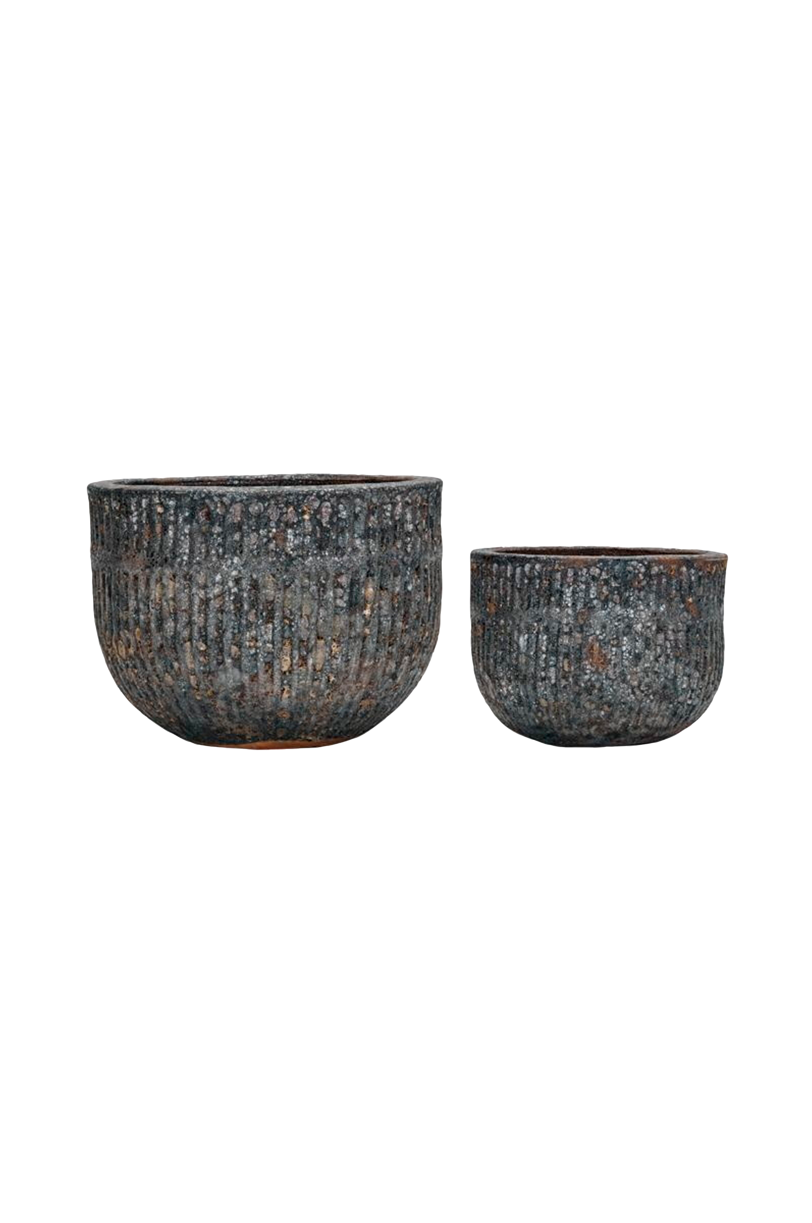 Forskøn dit rum med dette sæt af håndlavede, grå krukker i lertøj. Hver af de fint håndlavede krukker har karakteristiske riller og en unik, varierende gråtonet glasur, der sikrer, at ikke to er ens. Perfekt til at tilføje et strejf af håndværksmæssig elegance til ethvert rum. Giv dit rum et personligt præg med disse unikke krukker. S: h: 20 cm, dia: 26,5 cm. L: h: 26 cm, dia: 35,5 cm.