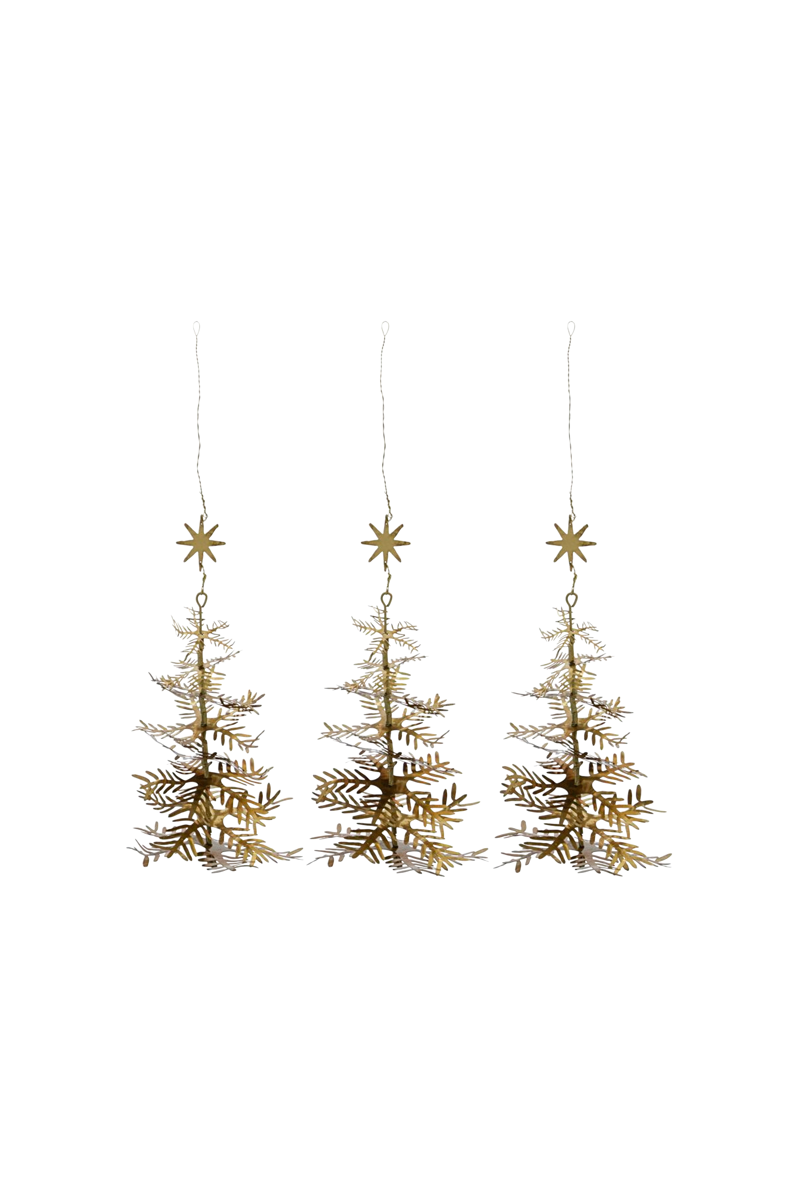 Dette sæt med 3 juletræer fra House Doctor er lavet af messing og er blevet udstyret med en stjerne på toppen. Da hver del er tynd nok til, at du kan bøje dem, kan du nemt give dem et mere 3D-agtigt look. Der er en lethed ved granerne, der gør dem perfekte til mange steder i dit hjem. På dit juletræ, hængende fra en gren eller i vinduet. Den klassiske gyldne nuance er en sofistikeret tilføjelse til enhver juledekoration. Nyd en varm og velkommende atmosfære, når juletræerne reflekterer lyset.