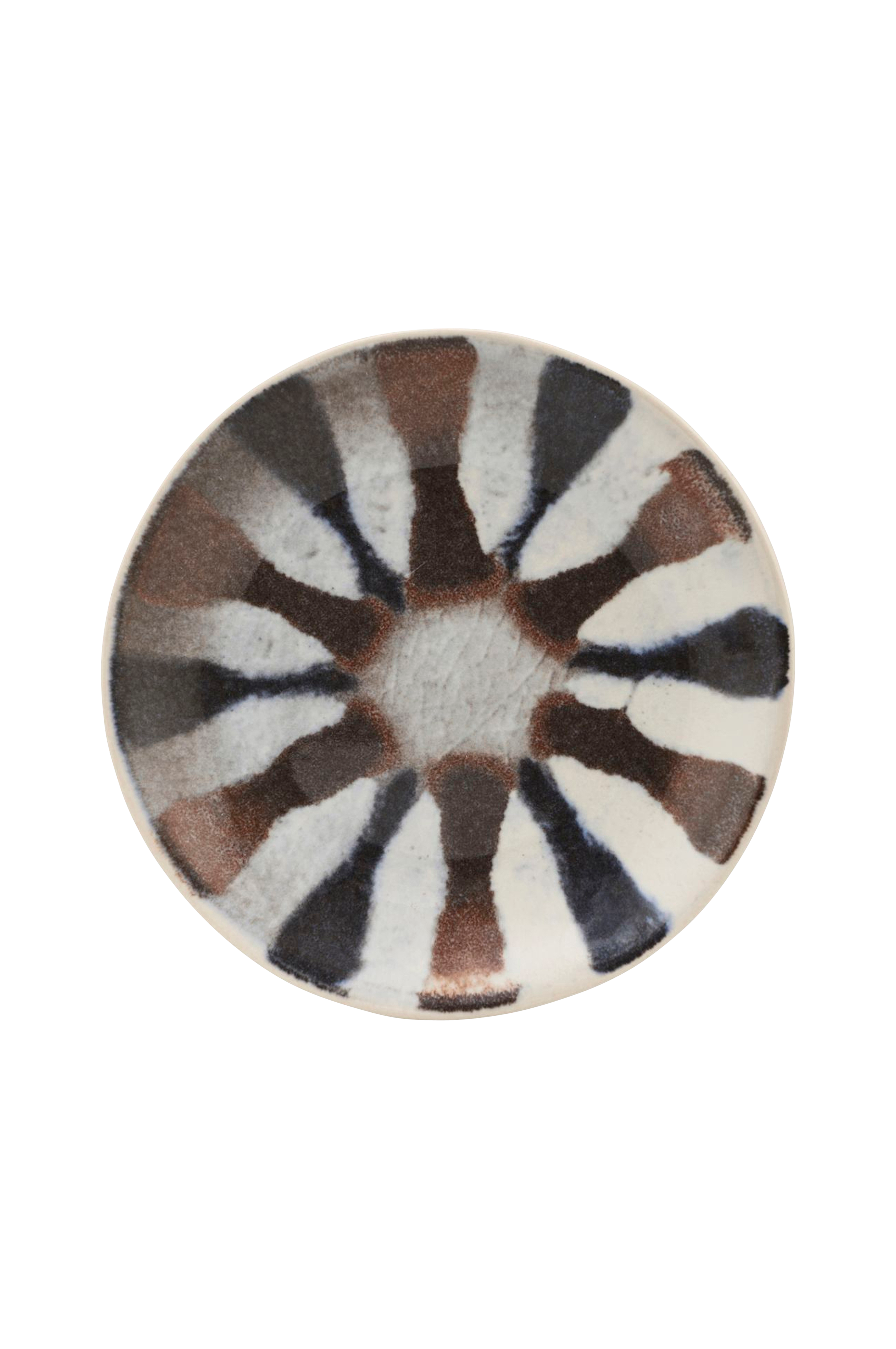 En personlig opdækning sætter prikken over i'et , når du inviterer til kaffe eller middag. Tallerken Suns fra House Doctor er fremstillet af stentøj og har smalle striber og mat glasur, som giver designet et rustikt touch. De mørke farver og tallerkenens fine størrelse betyder, at den passer perfekt til et stykke kage eller en forret, som du vil præsentere på smukkeste vis. Brug Suns som kontrast til lyse servicedele i forskellige mønstre, eller bland teksturer, farver og mønstre frit så det passer til dig og din personlige stil. Højde 2,2 cm og diameter 15 cm.