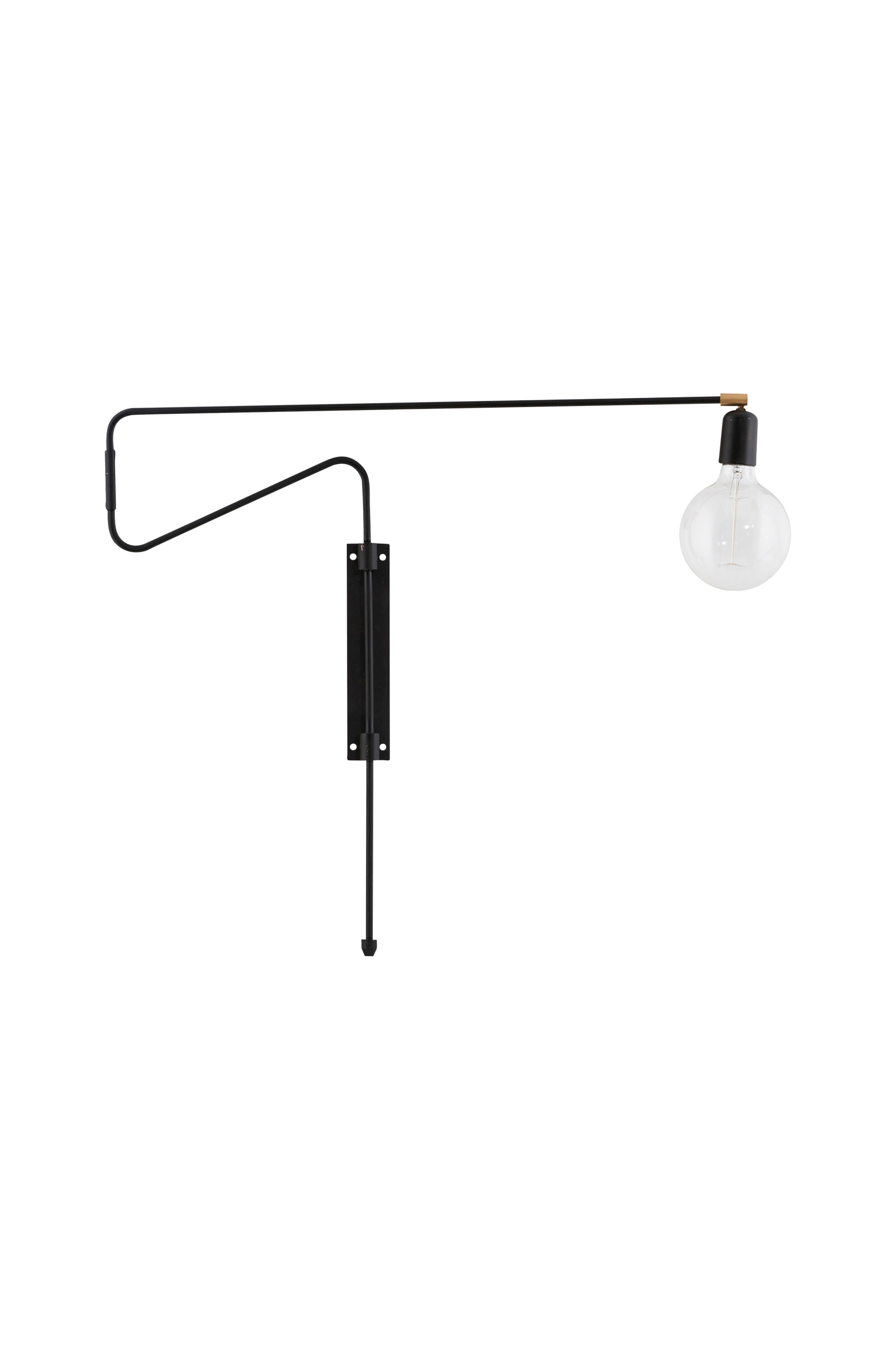 Anderledes og unik væglampe fra House Doctor. Swing har et spændende look og fungerer både som en praktisk pære og som en vidunderlig vægdekoration. Dette takket være dens asymmetriske og skrå vinkler. Lampen er lavet af sort jern og messing. Pære medfølger ikke. Længde 70 cm. E27, maks. 25 Watt, 2,2 m ledning.