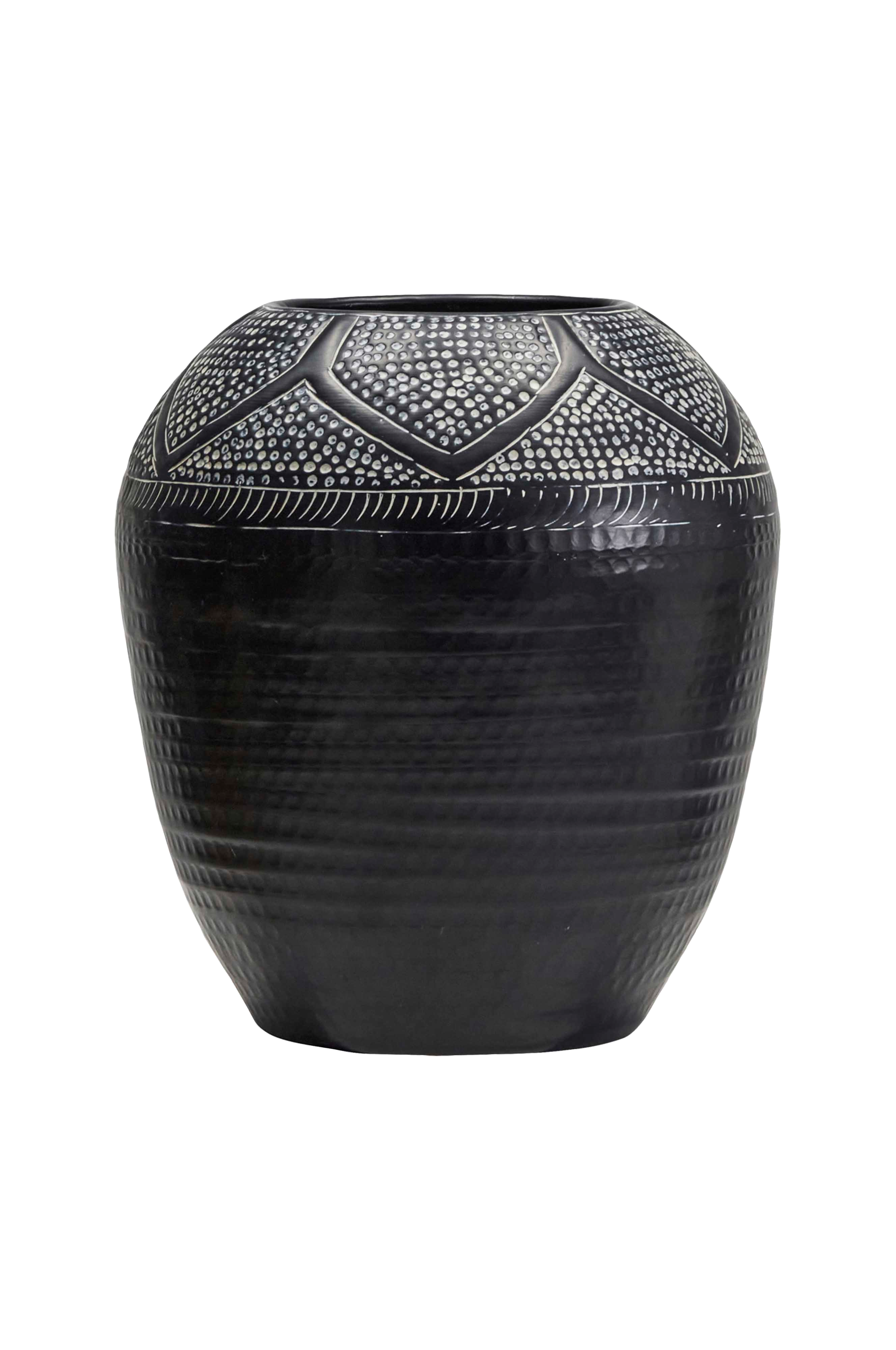 Giv din bolig et strejf af kunst med denne håndlavede vase med en udsøgt finish. Det prægede mønster giver hvert stykke en unik charme, som gør det til et fængslende kunstværk i sig selv. Den er perfekt til at fremvise store buketter eller grene, og den tilfører varme og personlighed til ethvert rum i dit hjem. Håndlavet med unikt design. Giv dit interiør varme og personlighed med denne kunstneriske vase.