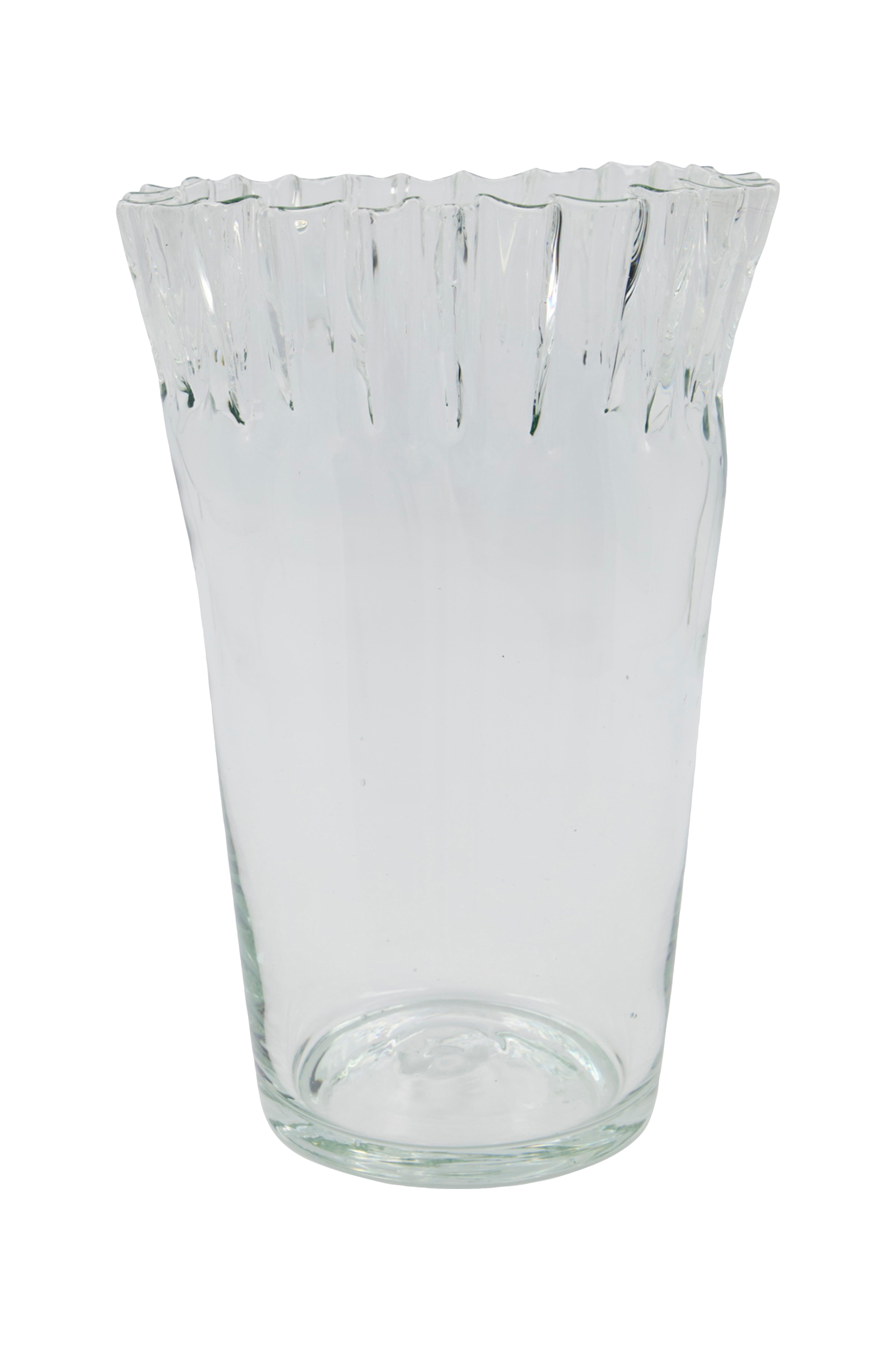Giv dit hjem et elegant præg med denne håndlavede, mundblæste vase i klart glas. Det gennemsigtige design og den kunstnerisk foldede kant gør den perfekt til at arrangere smukke buketter, og den er tidløs og passer perfekt til moderne indretning. Håndlavet, mundblæst håndværk. Tilføj et strejf af raffinement til din indretning med denne fantastiske vase.