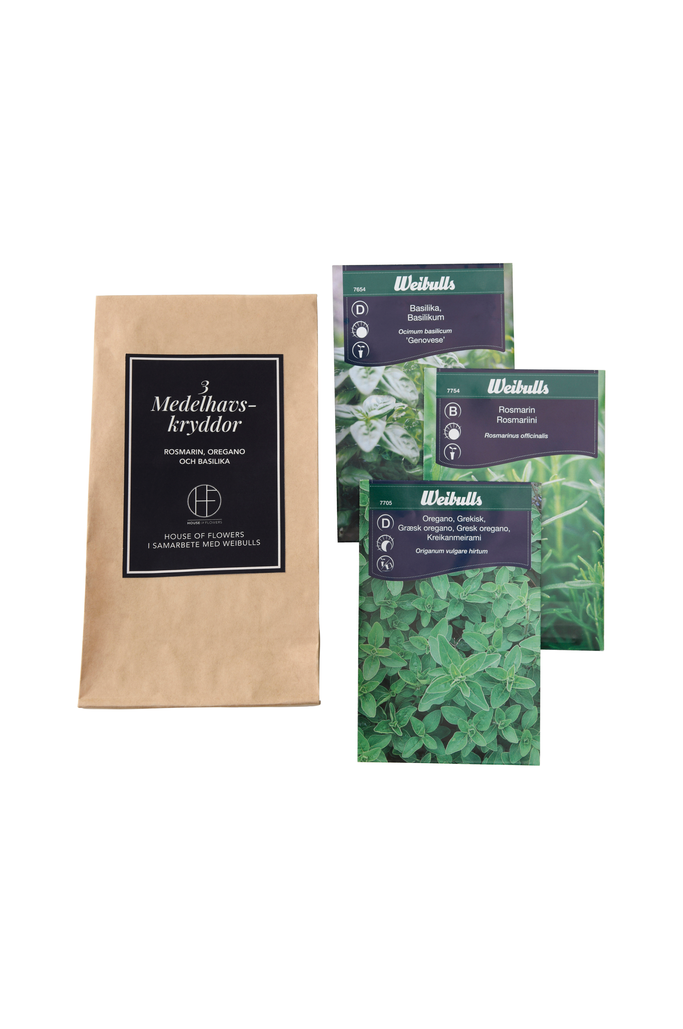 Frøpakke med middelhavskrydderurterne rosmarin, oregano og basilikum.