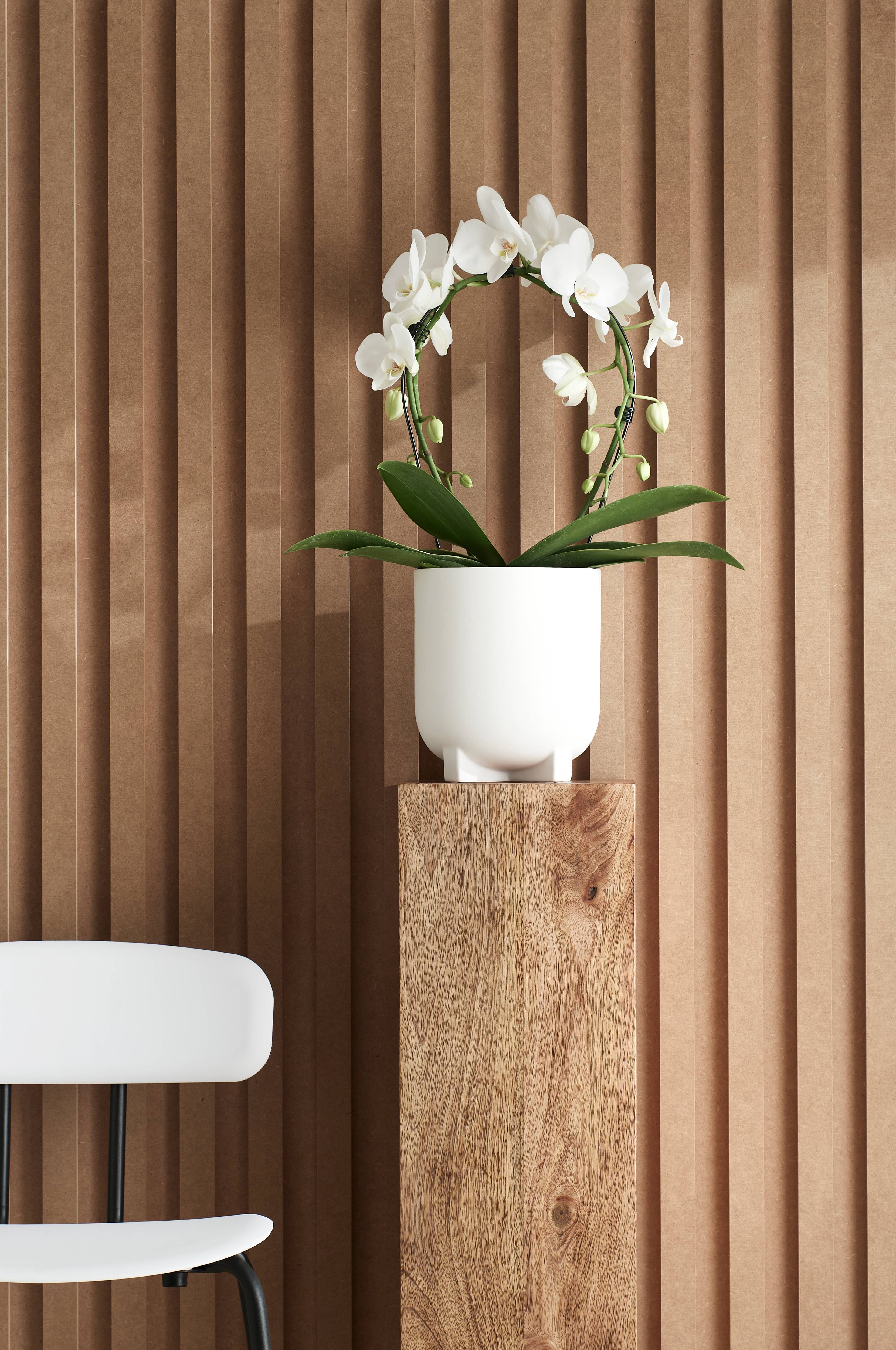 Smuk orkidé på stativ med hvide, dekorative blomster. Orkidéer skal vandes meget, men sjældent. Cirka en gang om ugen er tilstrækkeligt, lidt afhængigt af rummets fugtighed. Placeres lyst. Inderkrukke i plast, diameter 12 cm.