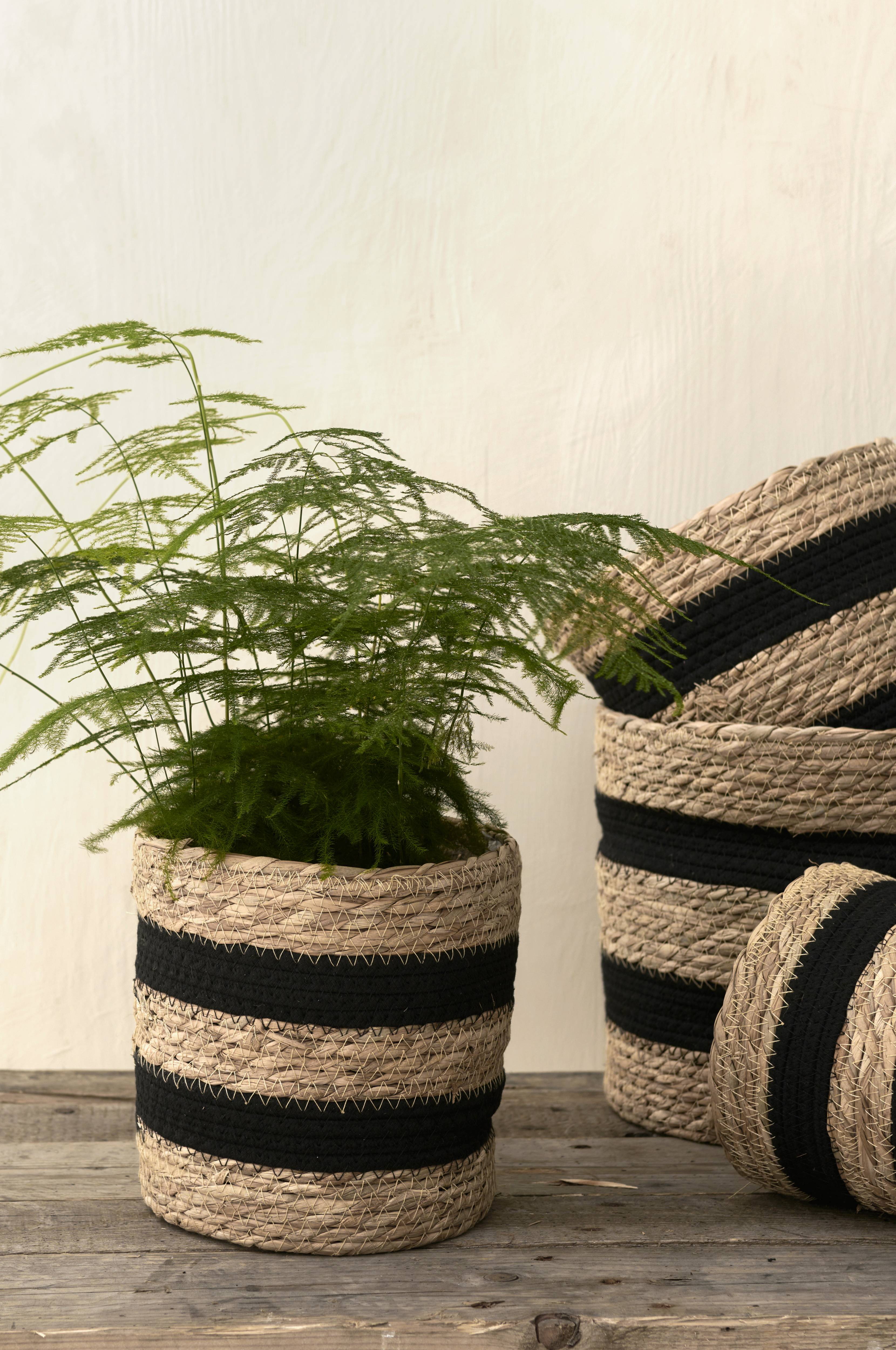 Stilren skjuler i flettet kurv. Perfekt til planter da de er plastforseglede indvendigt. Højde 21 cm. Diameter 21 cm