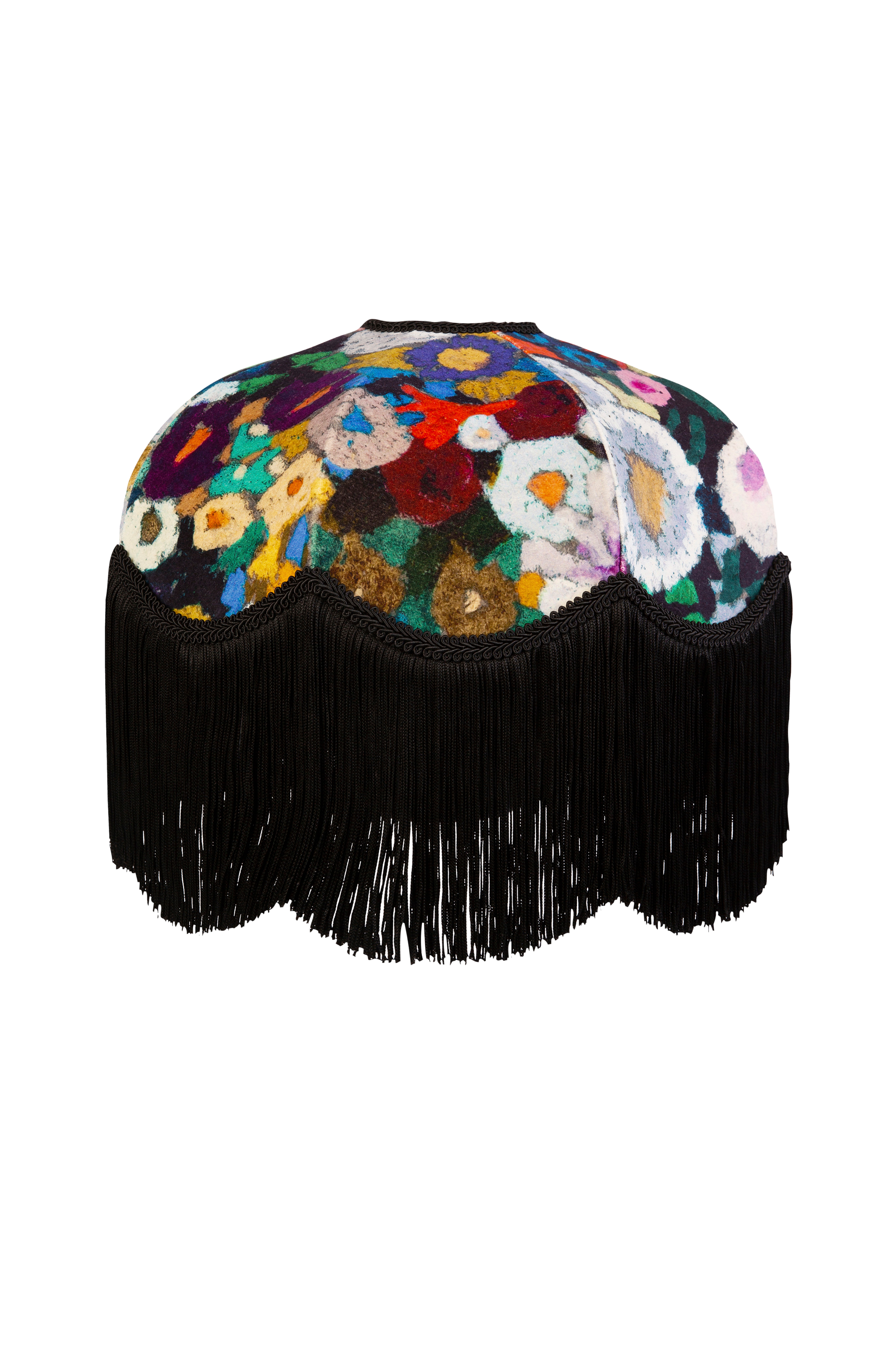Fortab dig i Woodstocks fortryllende blomster med denne flerfarvede, luksuriøse kampskærm med en velourblød eng af 1960'er-inspirerede, psykedeliske blomster. Mål: D: 42 cm x H: 16 cm + 15 cm frynser x Foroven: 10 cm