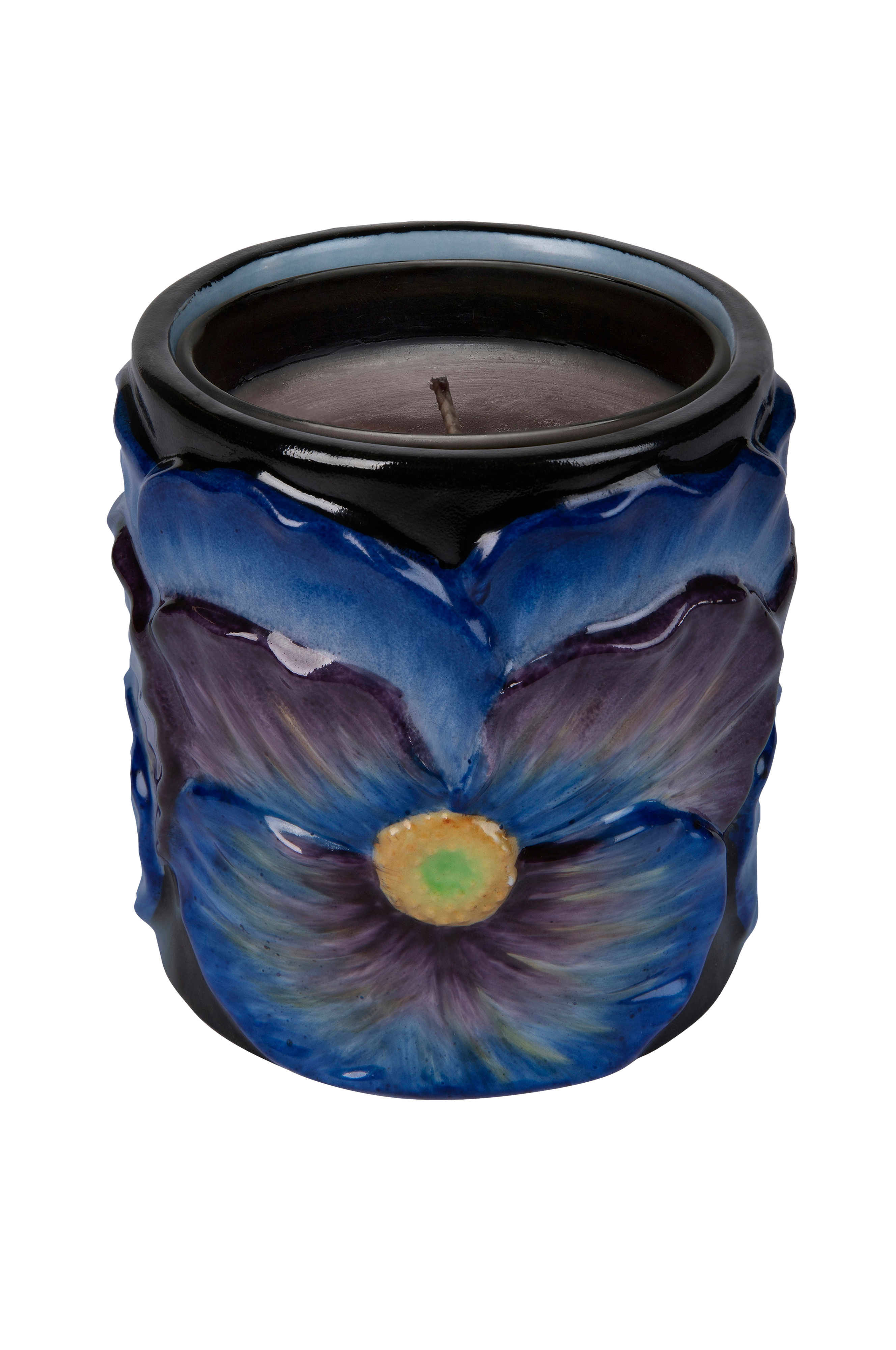 Violens skønhed er fanget i denne lilla og blå lysestage af keramik. Sort lys, der dufter af granatæble og krydret træ. Det er et perfekt supplement til din boligindretning. Størrelse 12,5 cm x 6 cm