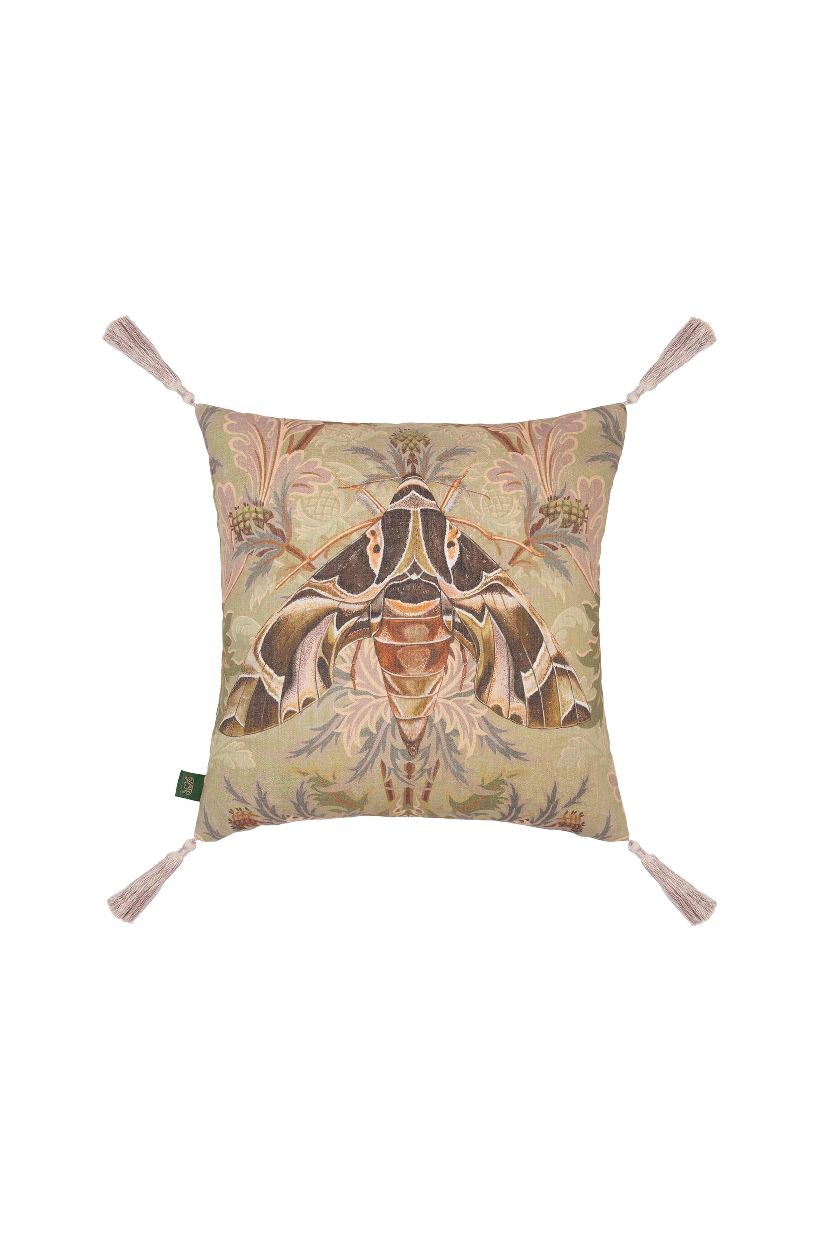 Som et møl til en flamme kan du ikke undgå at blive tiltrukket af dette behagelige væsen. Vores storslåede natsværmer hviler på en seng af hellig havtorn takket være vores Aquifolia damaskprint, fremstillet af 65 % økologisk bomuld, 25 % genbrugsbomuld og 10 % hør. Fyldt med ansvarligt indkøbt uld og afsluttet med kvaster. 45 cm x 45 cm