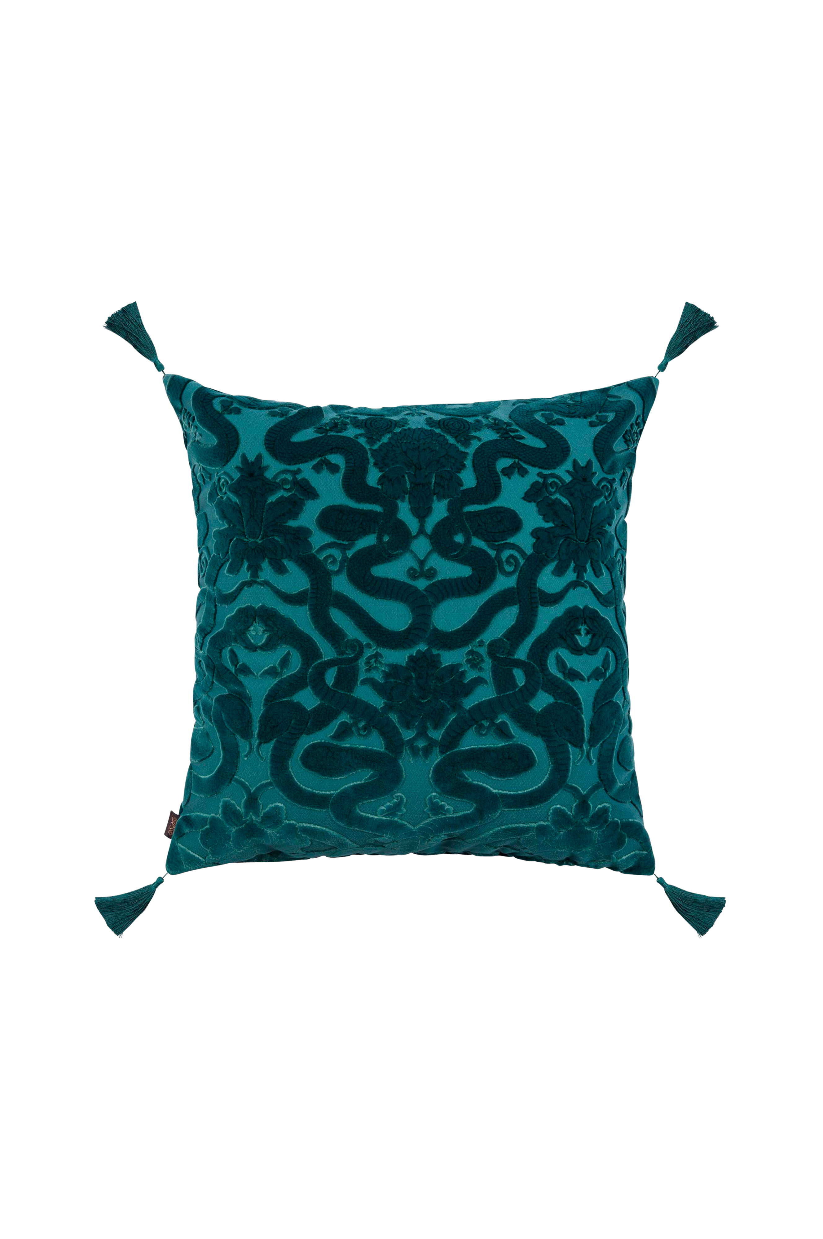 Anaconda fanger naturens fortryllelse med illusioner fra Paradisets have. Anaconda afspejler elegance med slanger og eksotiske blomster. Fremstillet i England af taktil, engelsk velour. Størrelse 60x60 cm, skal kemisk renses. Fyldet er lavet af engelsk uld, som er meget miljøvenligt, støvmidefrit og velegnet til allergikere.